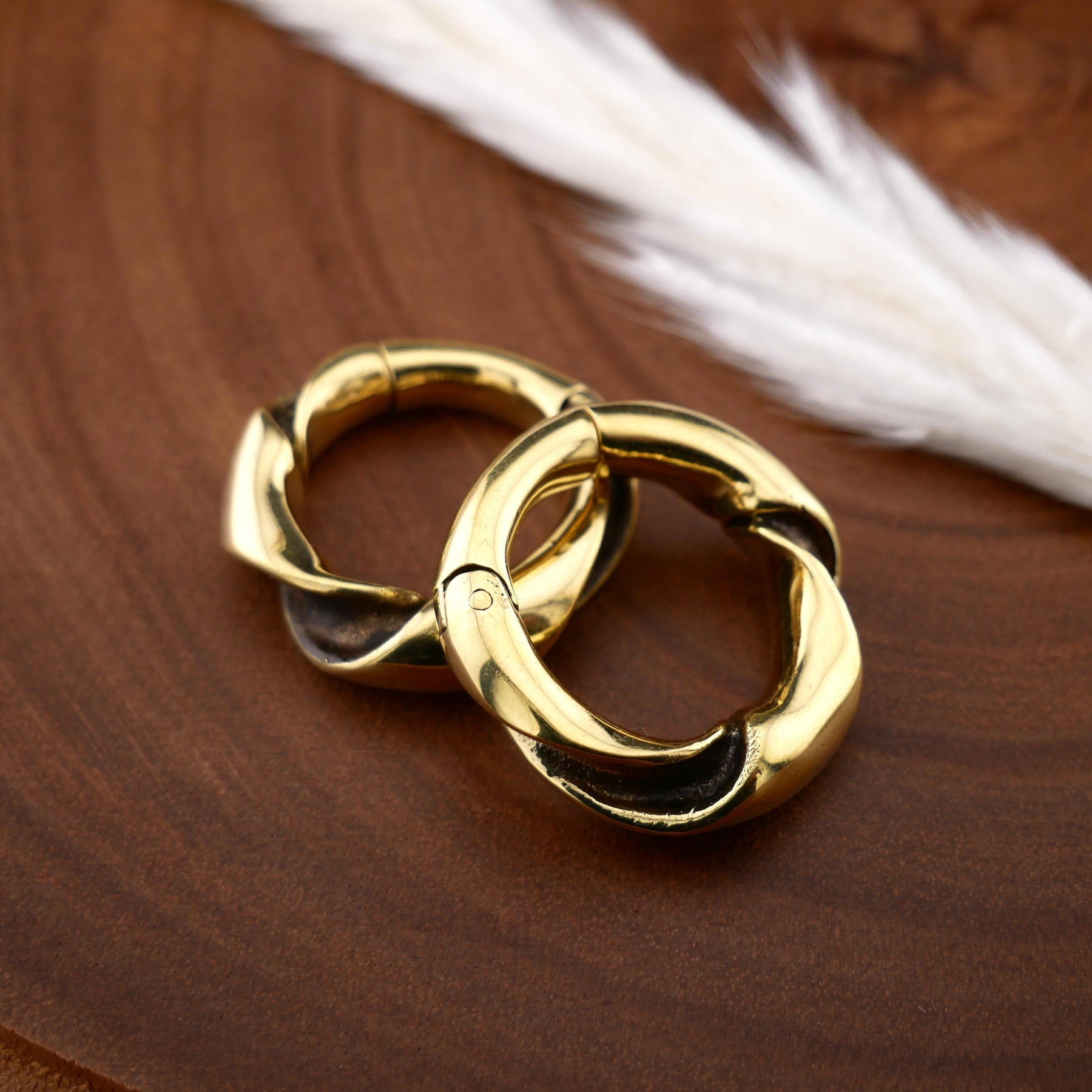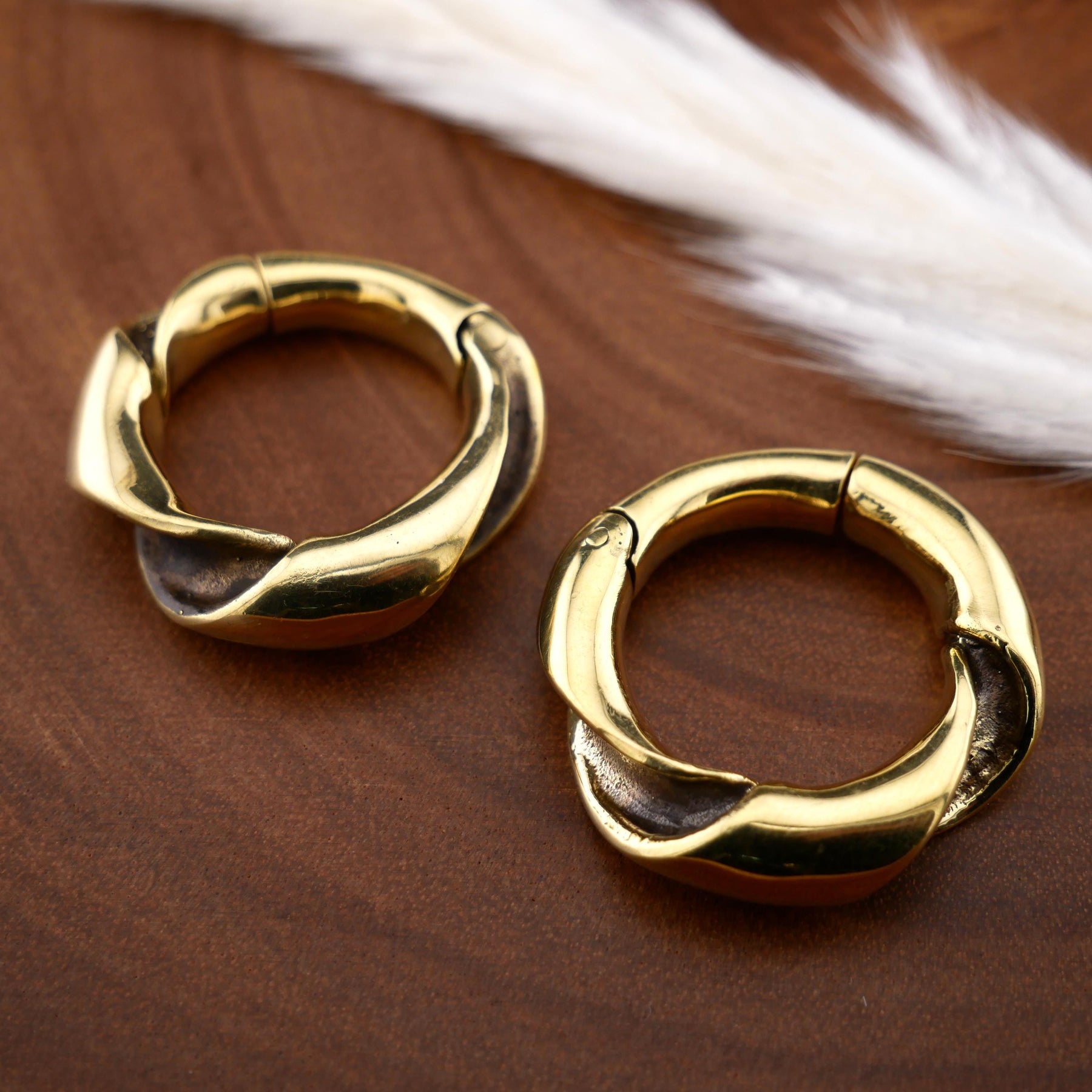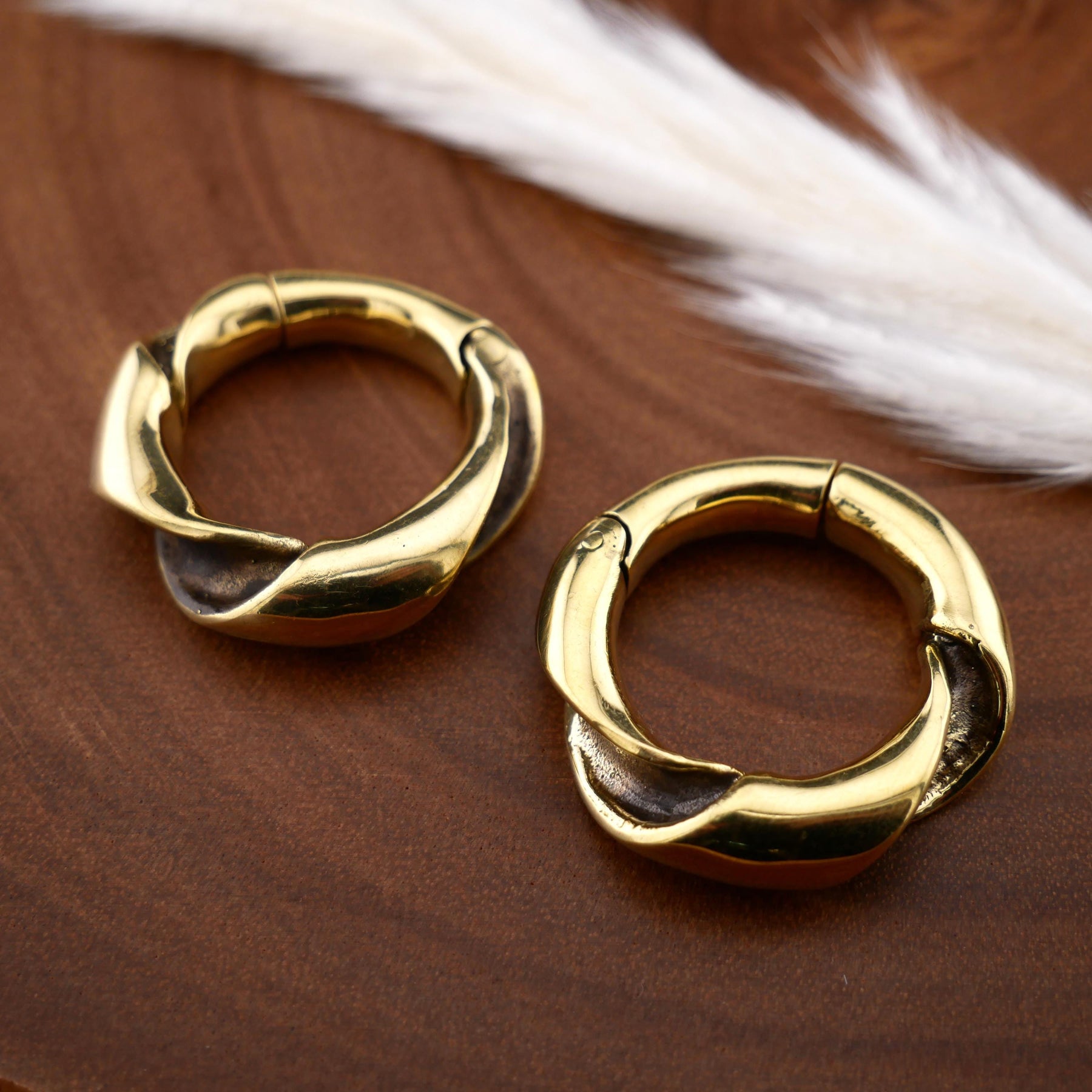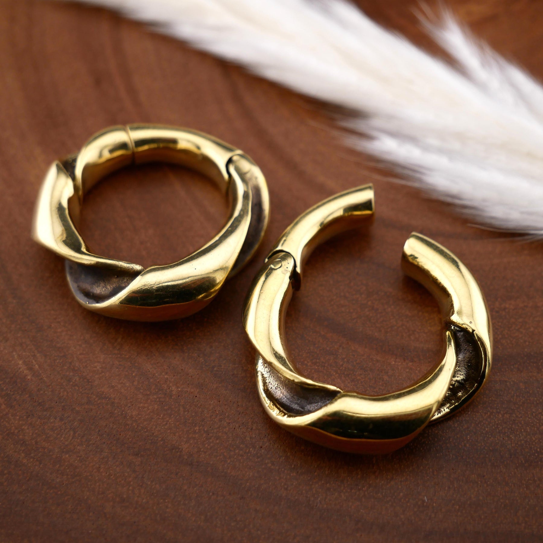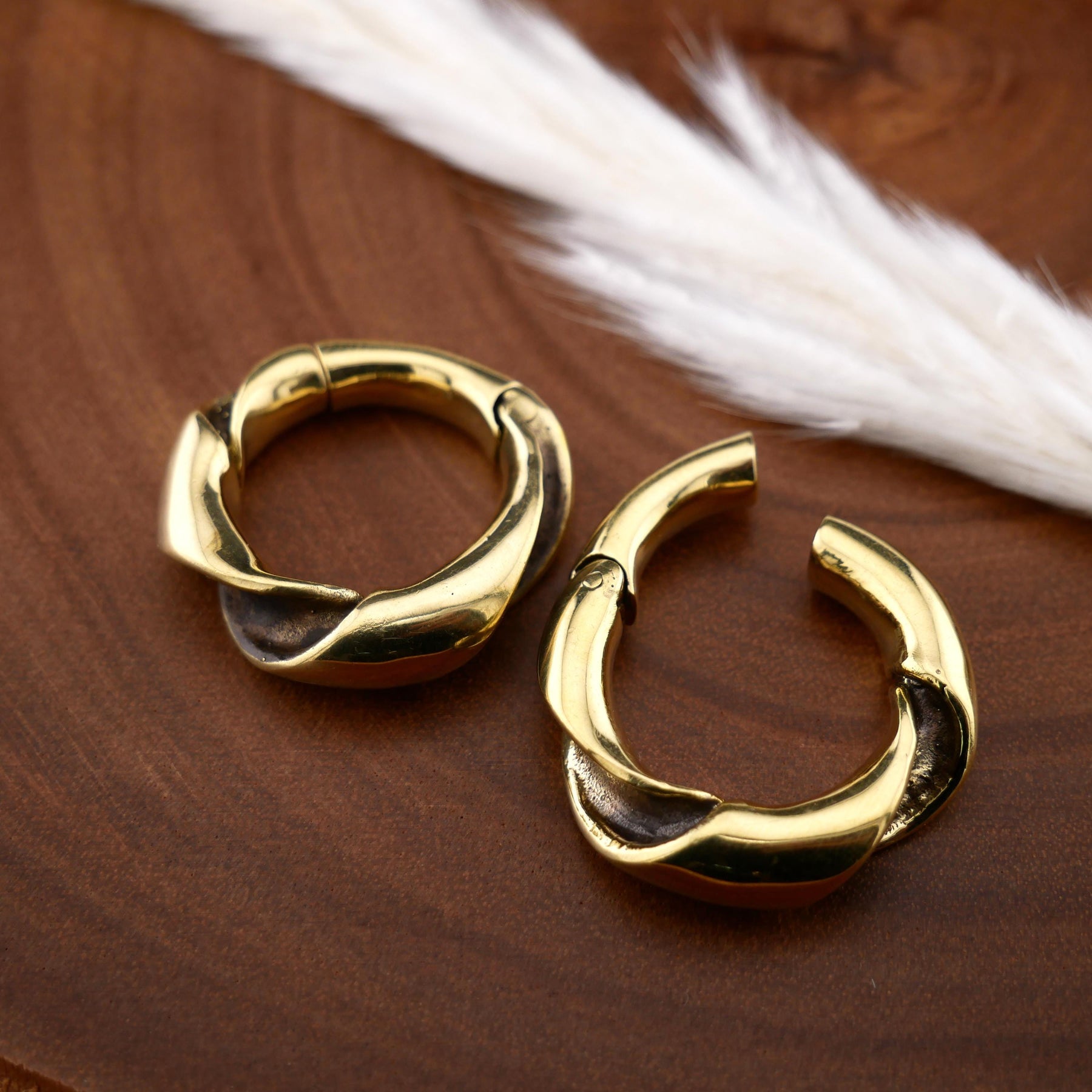 Diese eleganten Ohrgewichte aus goldfarbenem Messing sind in einem wunderschönen, verdrehten Design gehalten. Sie sind schlicht, aber modern und verleihen deinem Look das gewisse Etwas. Mit einem Gewicht von je 21g, einer Größe von 34x34mm und einem praktischen Magnetverschluss sind sie perfekt für Ohrlöcher ab einer Steggröße von 6mm. Ein stylisches Accessoire für jeden Tag!