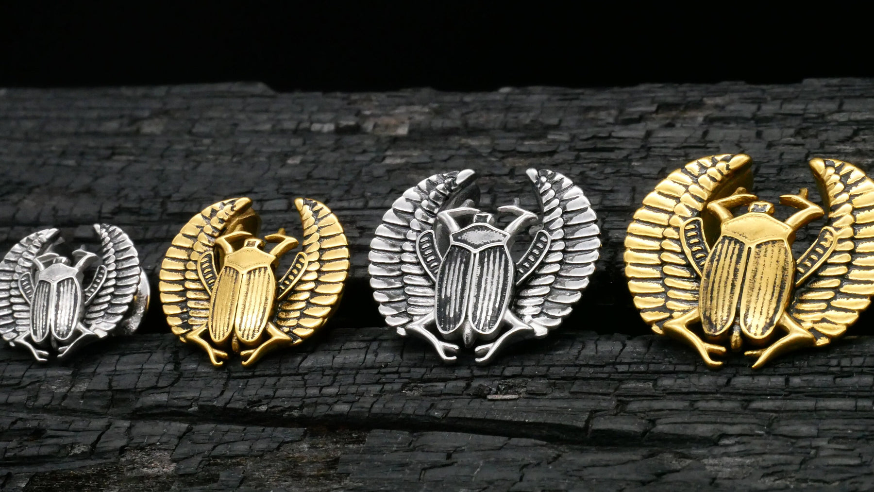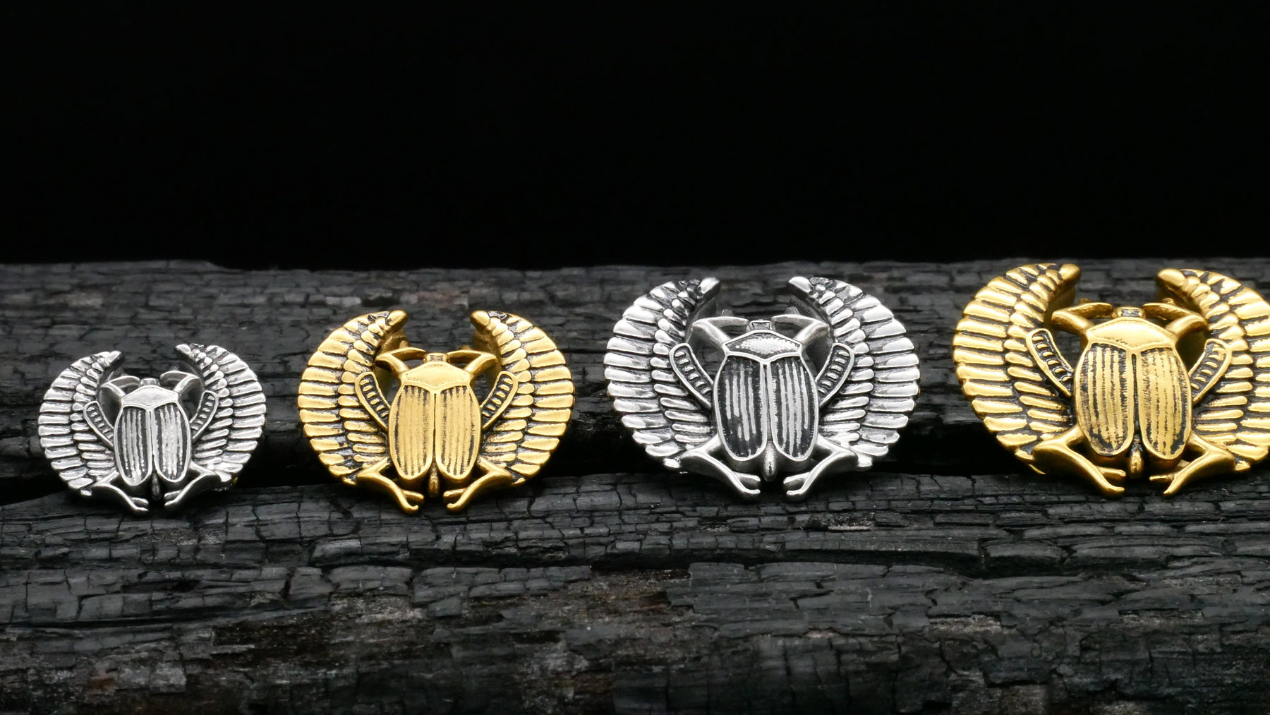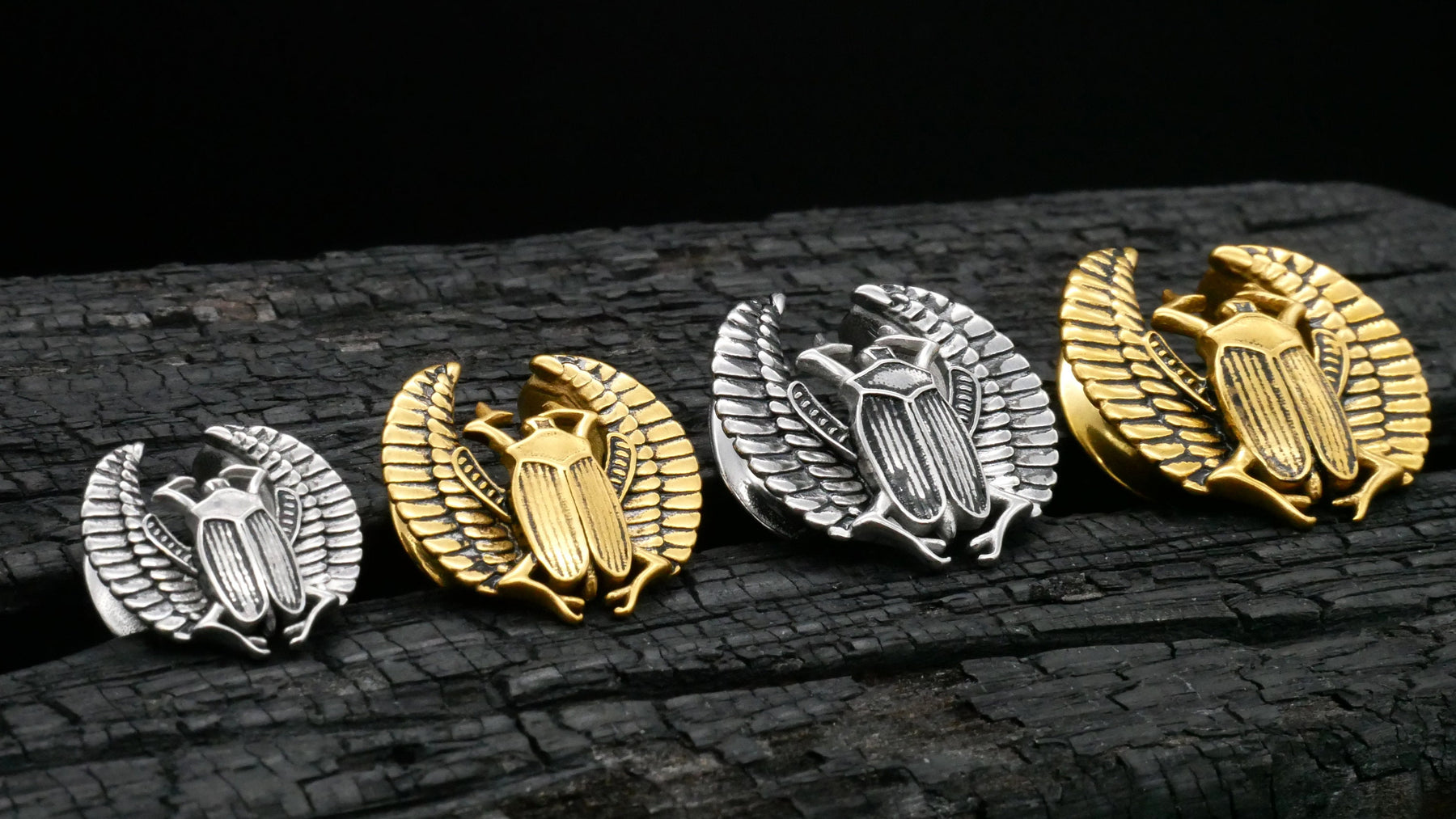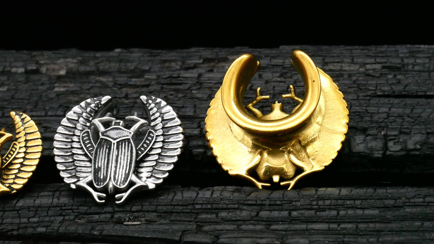 Der ägyptische Skarabäuskäfer, eines der bedeutendsten Symbole in der Geschichte der alten ägyptischen Zivilisation, ziert diesen Ohrplug. In der ägyptischen Kunst, Ikonographie und Religion repräsentiert der Skarabäus die Sonne, Leben, Regeneration und Auferstehung. Die kunstvolle Darstellung des Käfers auf dem Ohrplug fängt die Essenz dieses Symbols ein und verleiht dem Schmuck eine tiefgreifende Bedeutung.