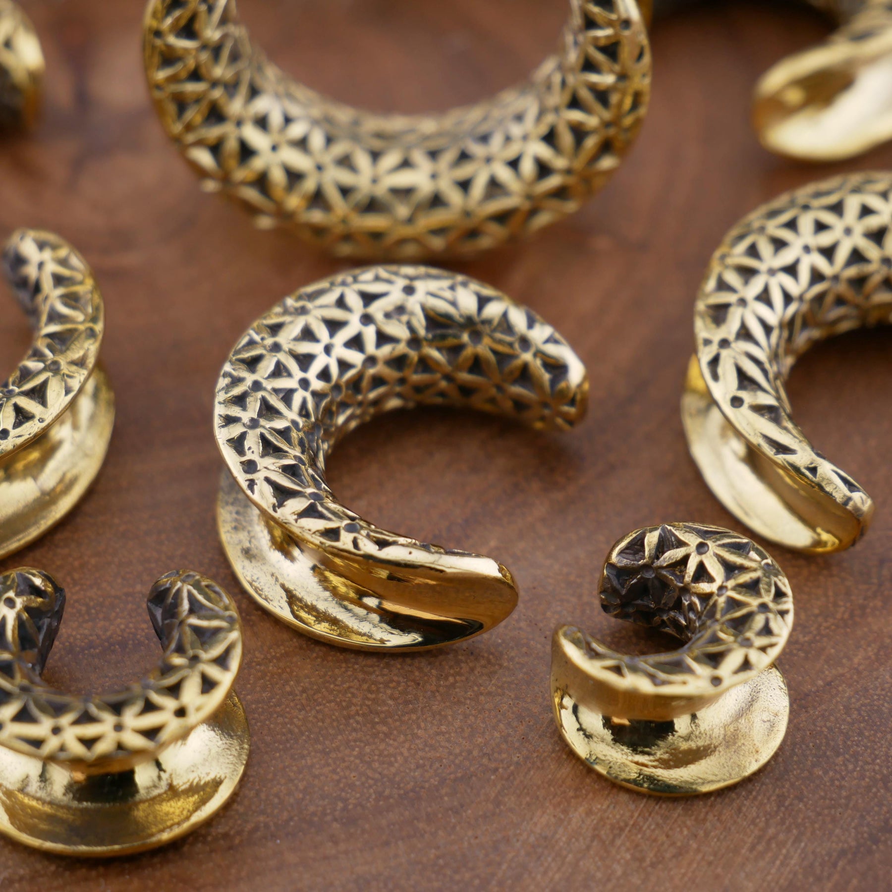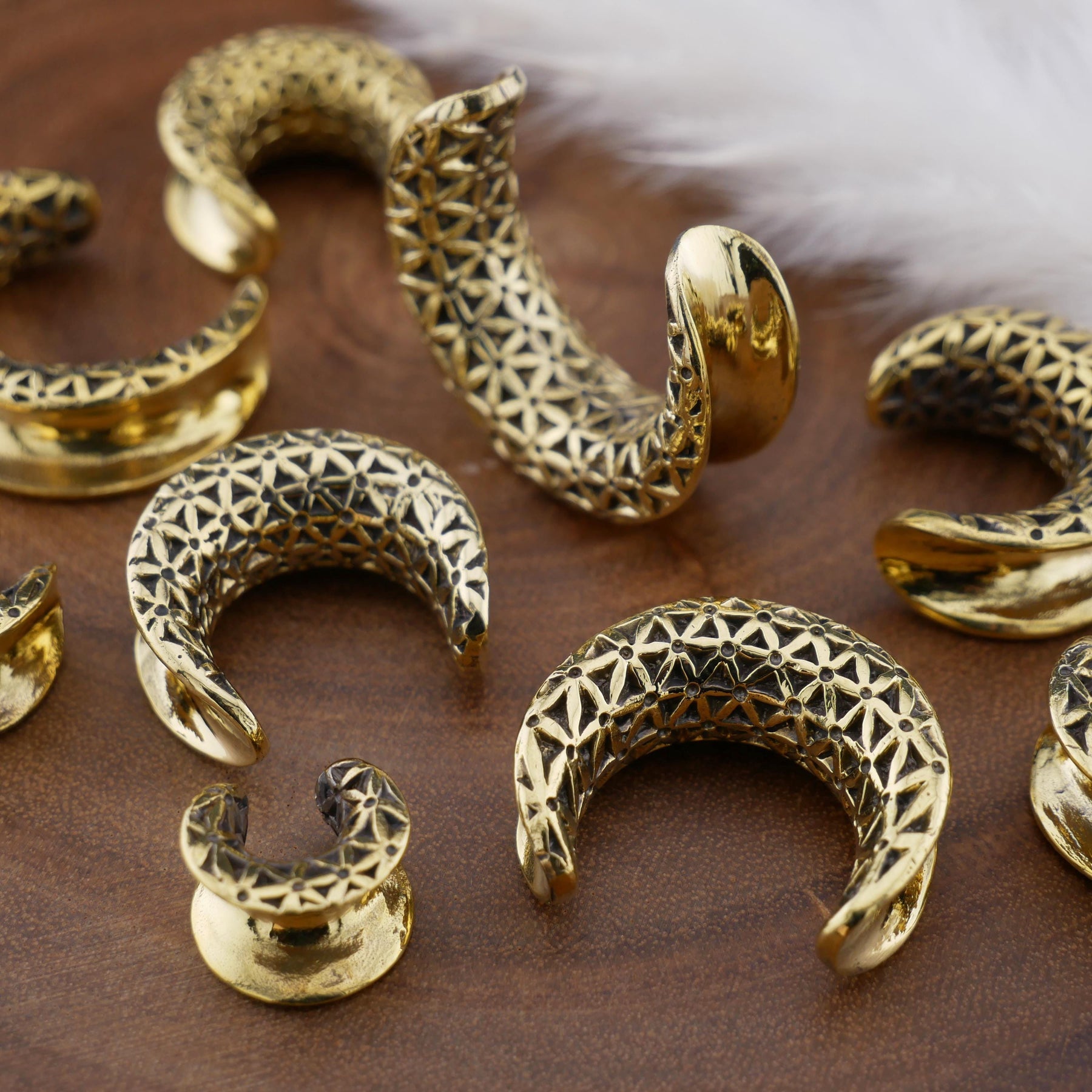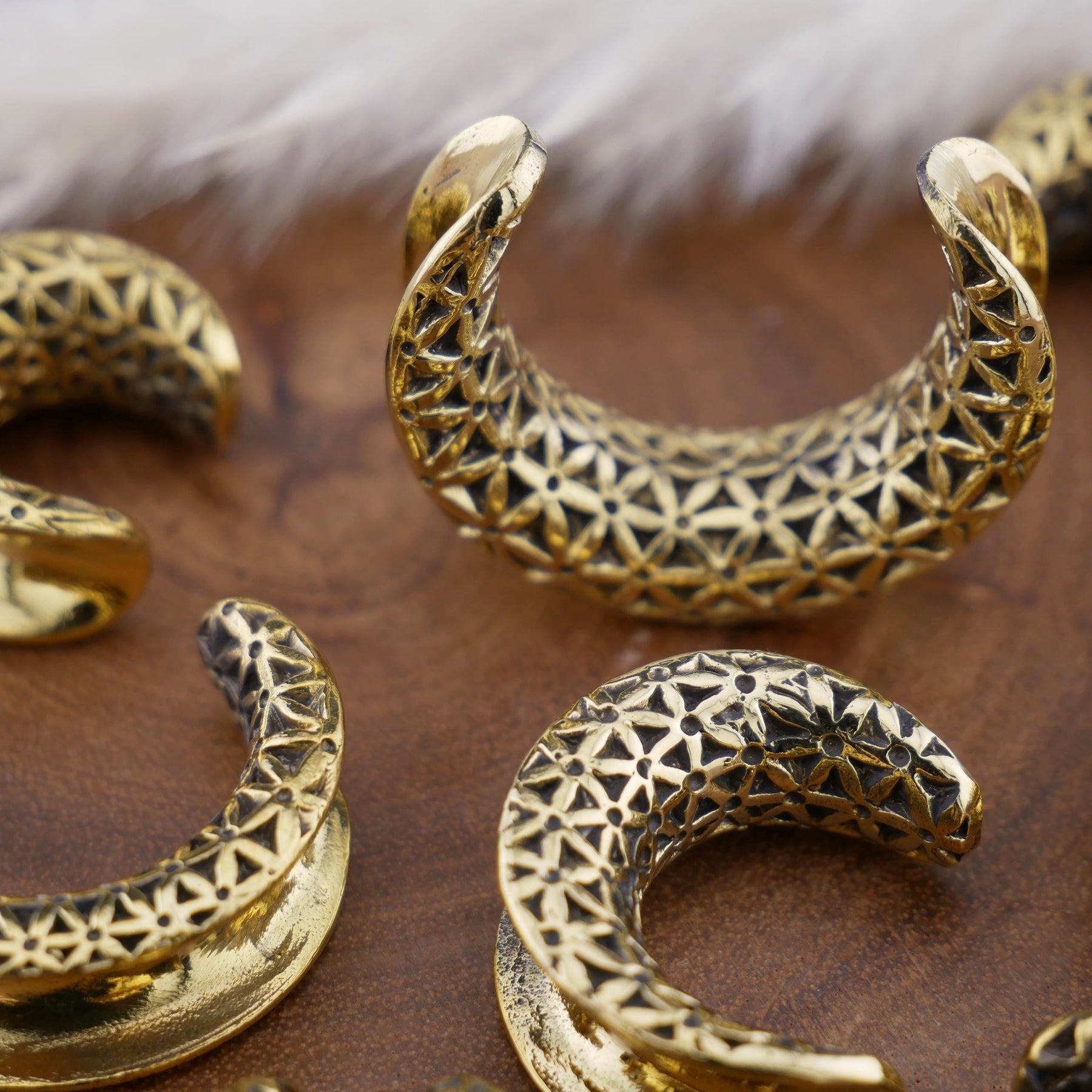 Eleganter Saddle Plug aus goldfarbenem Messing mit feinem, an die Lebensblume erinnernden Motiv. Verfügbar in Größen von 8-25 mm. Bequem zu tragen, hochwertig verarbeitet - ein stilvolles Highlight für dein Ohr!