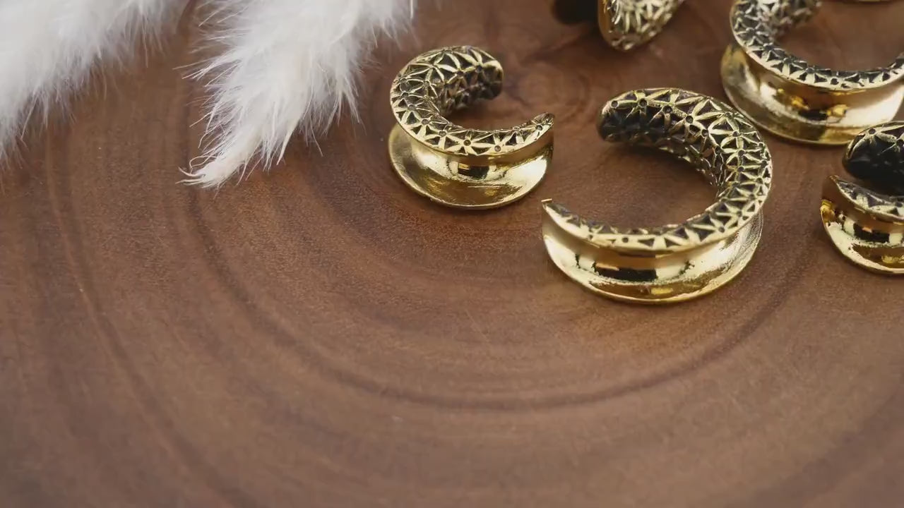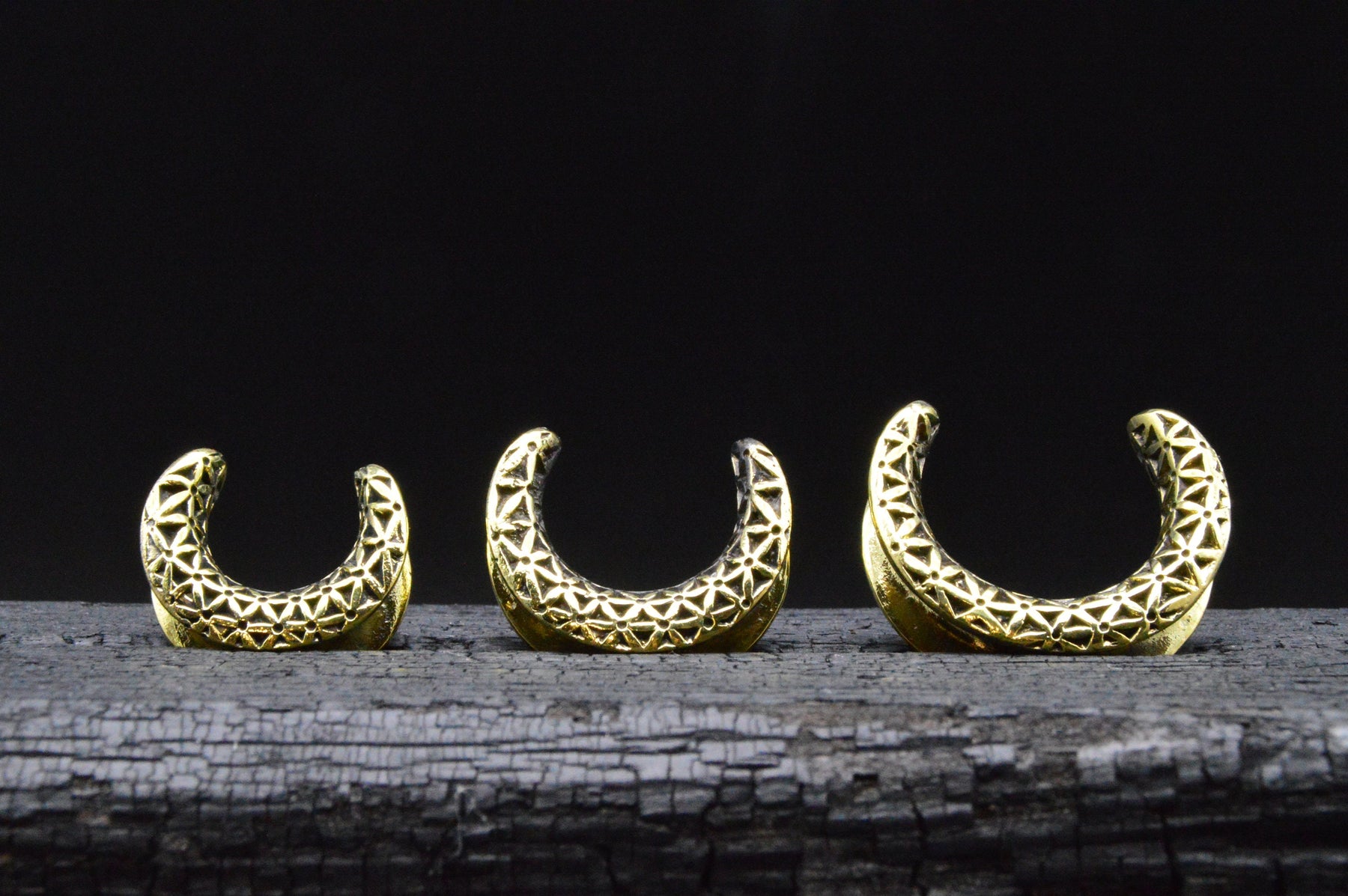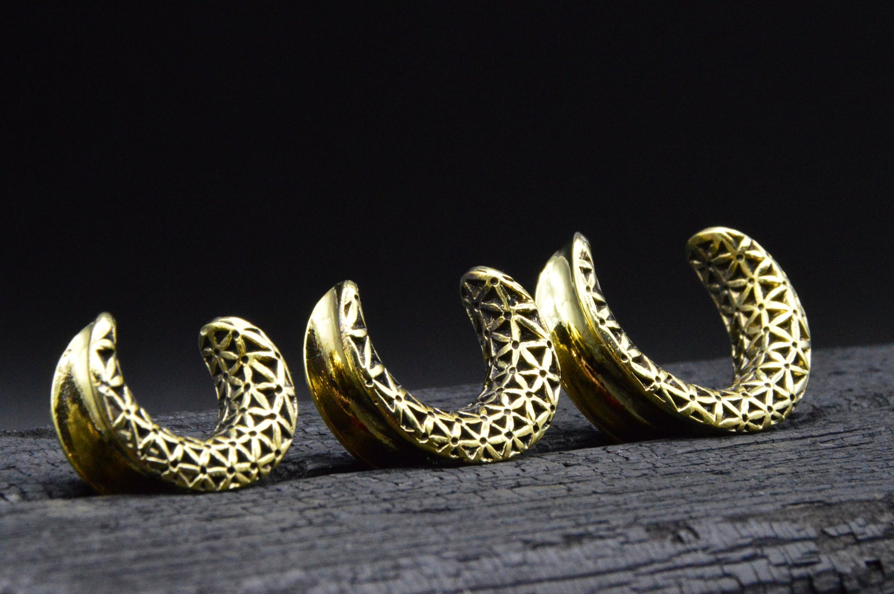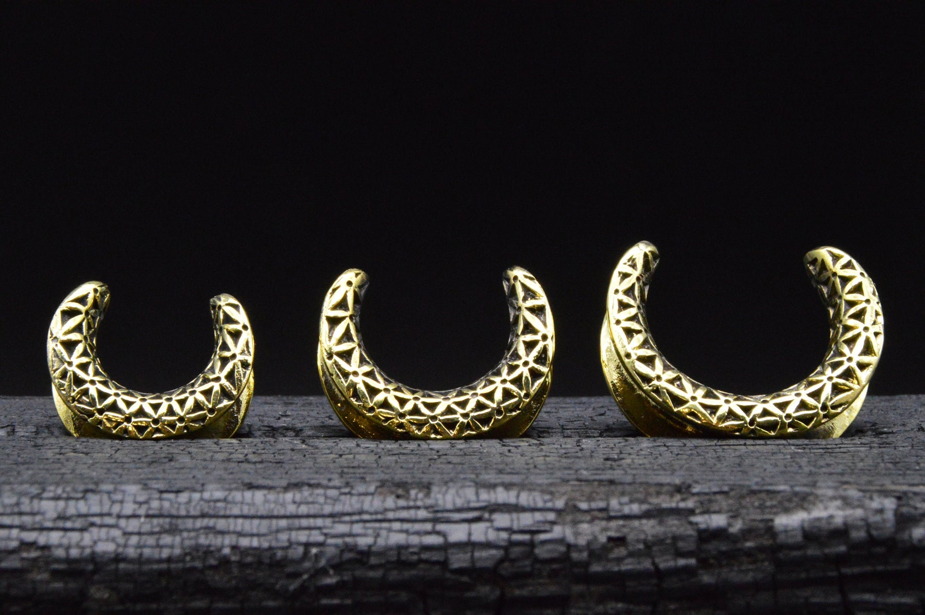 Eleganter Saddle Plug aus goldfarbenem Messing mit feinem, an die Lebensblume erinnernden Motiv. Verfügbar in Größen von 8-25 mm. Bequem zu tragen, hochwertig verarbeitet - ein stilvolles Highlight für dein Ohr!