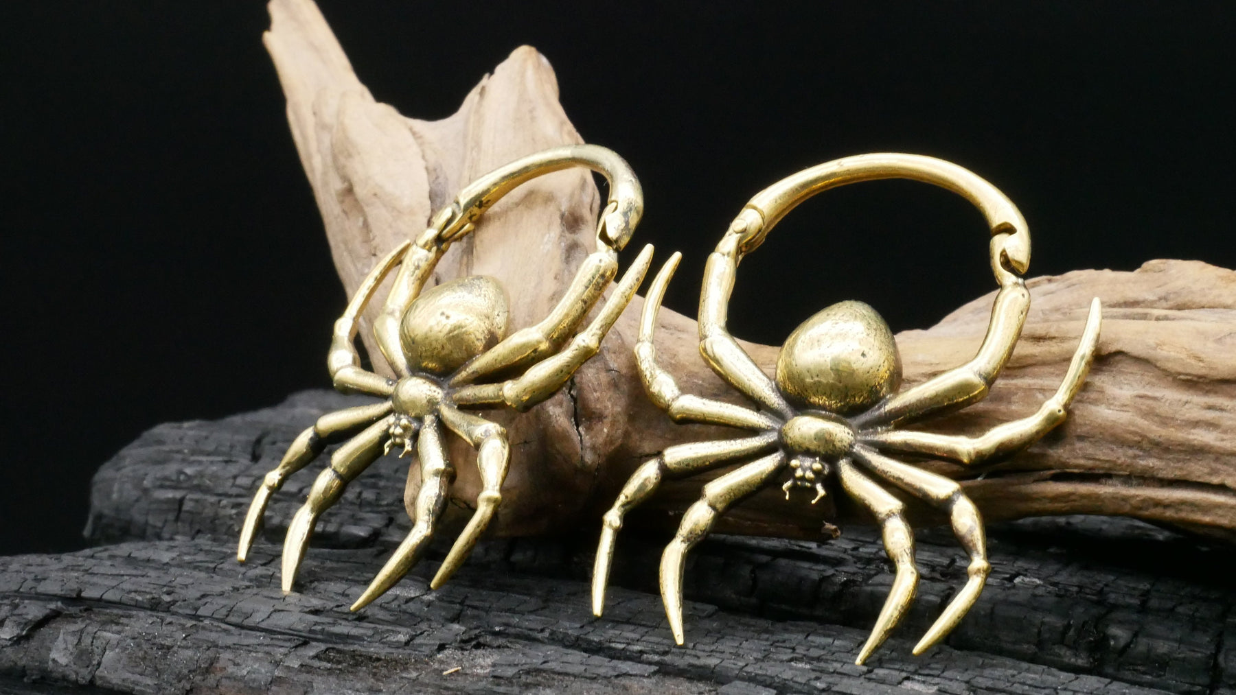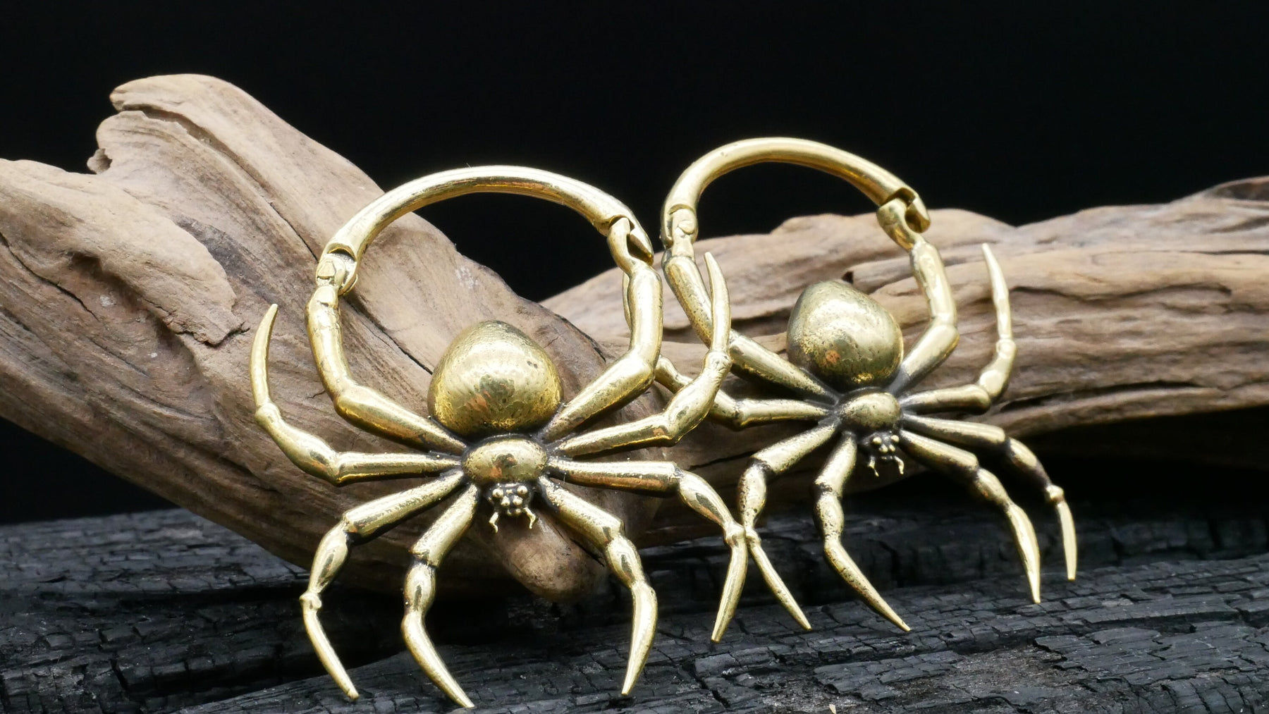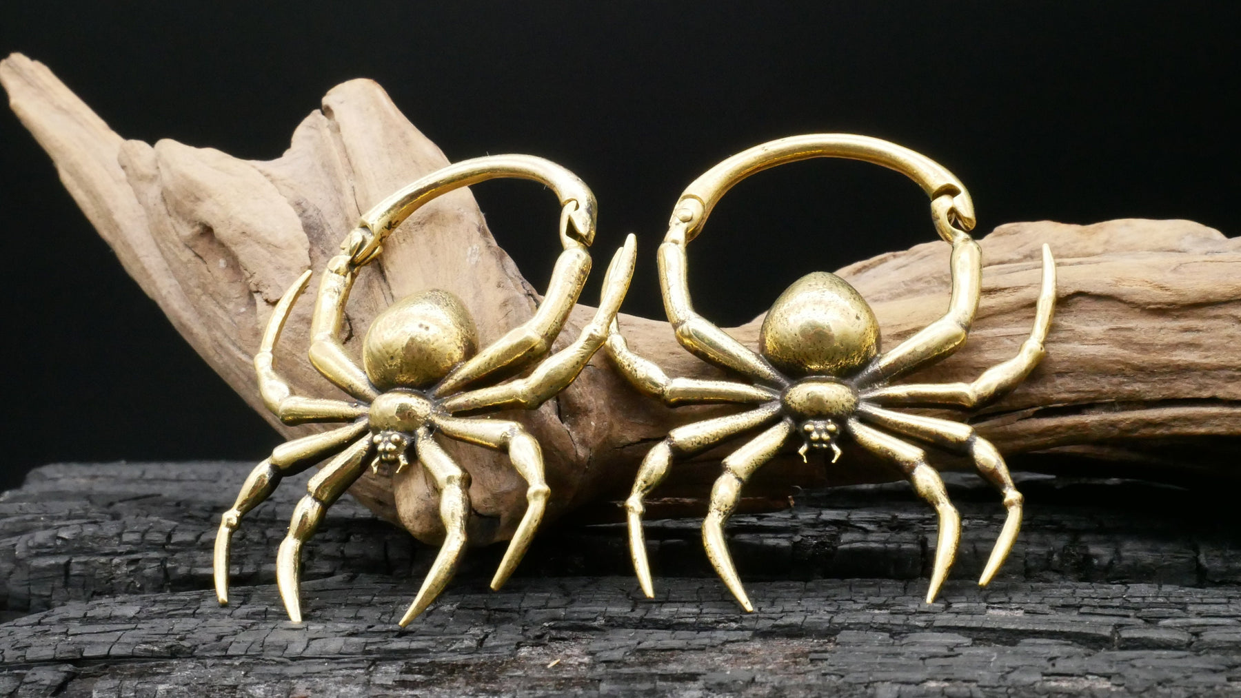 Diese goldfarbenen Ohrringe aus robustem Messing zeigen das faszinierende Motiv der Schwarzen Witwe. Der sichere Klickverschluss und die angenehme Dicke von 2,0 mm bieten Tragekomfort und Stabilität. Mit großzügigen Abmessungen von 4,0 cm in der Breite und 5,0 cm in der Höhe sind sie ein auffälliges Accessoire, das Eleganz und Raffinesse verkörpert. Ein Paar Ohrringe, das Ihren Look mit einem Hauch von Mystik und Stil vervollständigt.