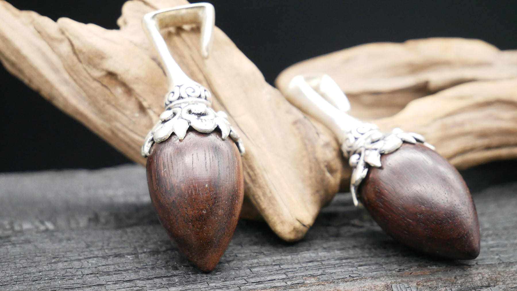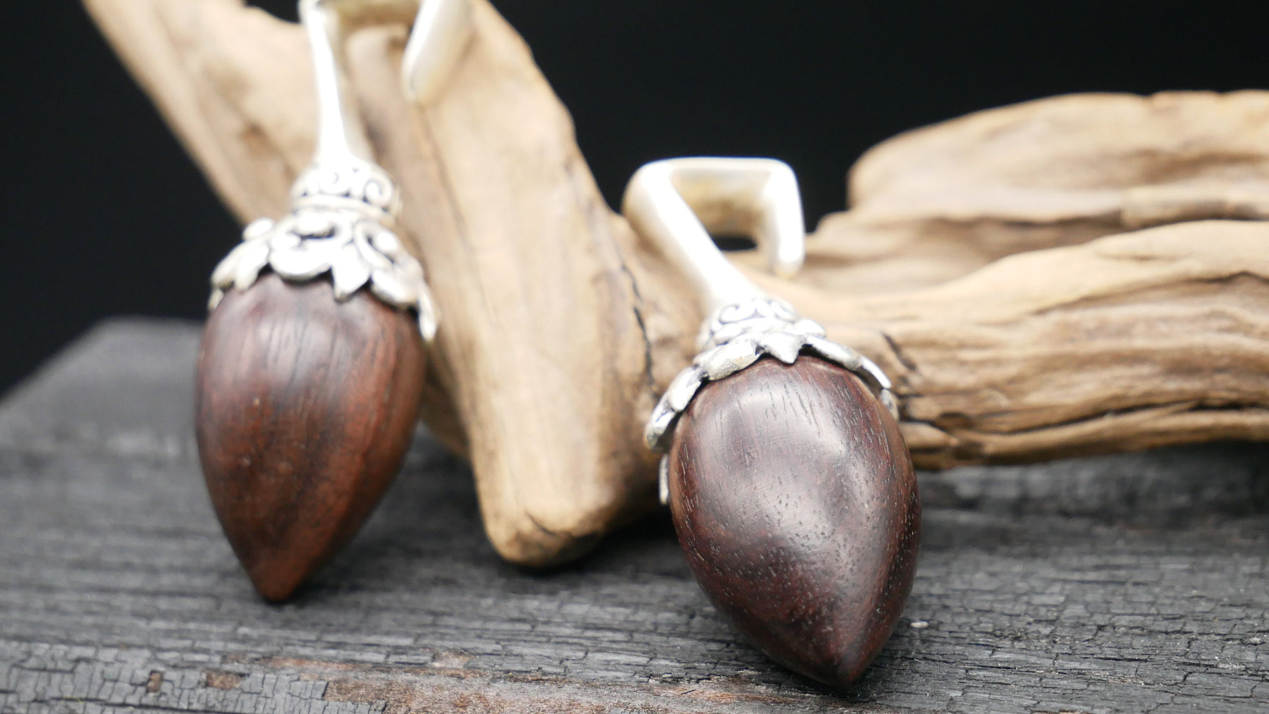 Wunderschönes Ohrgewicht aus versilbertem Messing und Holz.