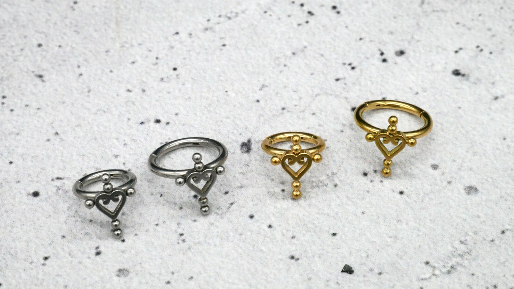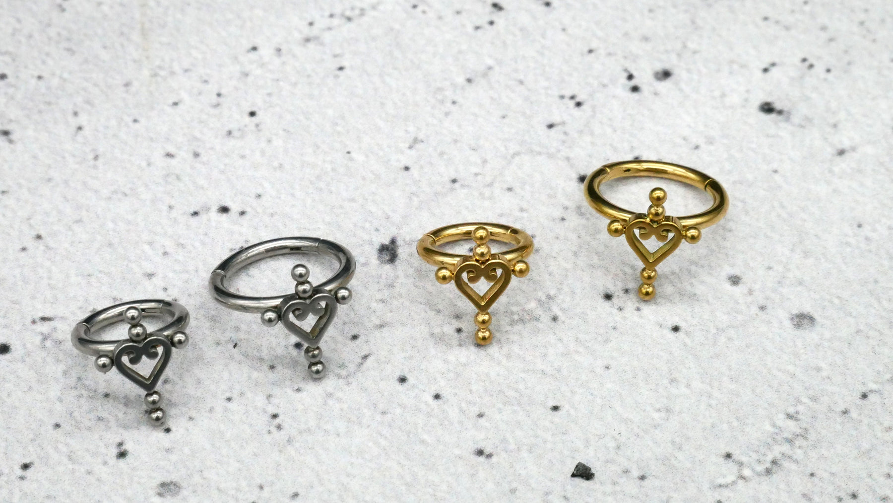 Entdecke mit unserem exquisiten Piercing für Helix, Daith und Nostril aus hochwertigem Chirurgenstahl den perfekten Ausdruck deiner Persönlichkeit. Wähle zwischen edlem Gold oder zeitlosem Silber und genieße höchste Qualität mit einer Stärke von 1,2mm. Personalisiere dein Piercing mit einem Innendurchmesser von 6mm oder 8mm und erlebe müheloses An- und Ausziehen dank des praktischen Klickverschlusses. Das filigrane Herz-in-Kreuz-Motiv verleiht deinem Look eine besondere Note. Setze ein Statement mit Stil und Individualität - dein Piercing, deine Geschichte.