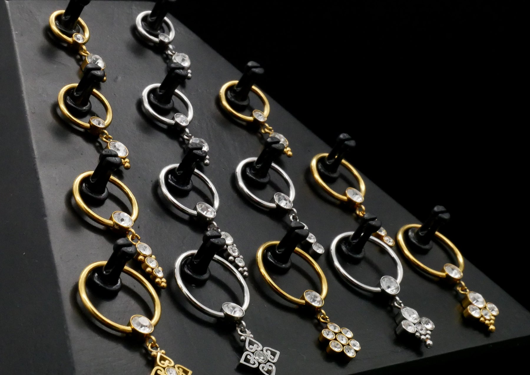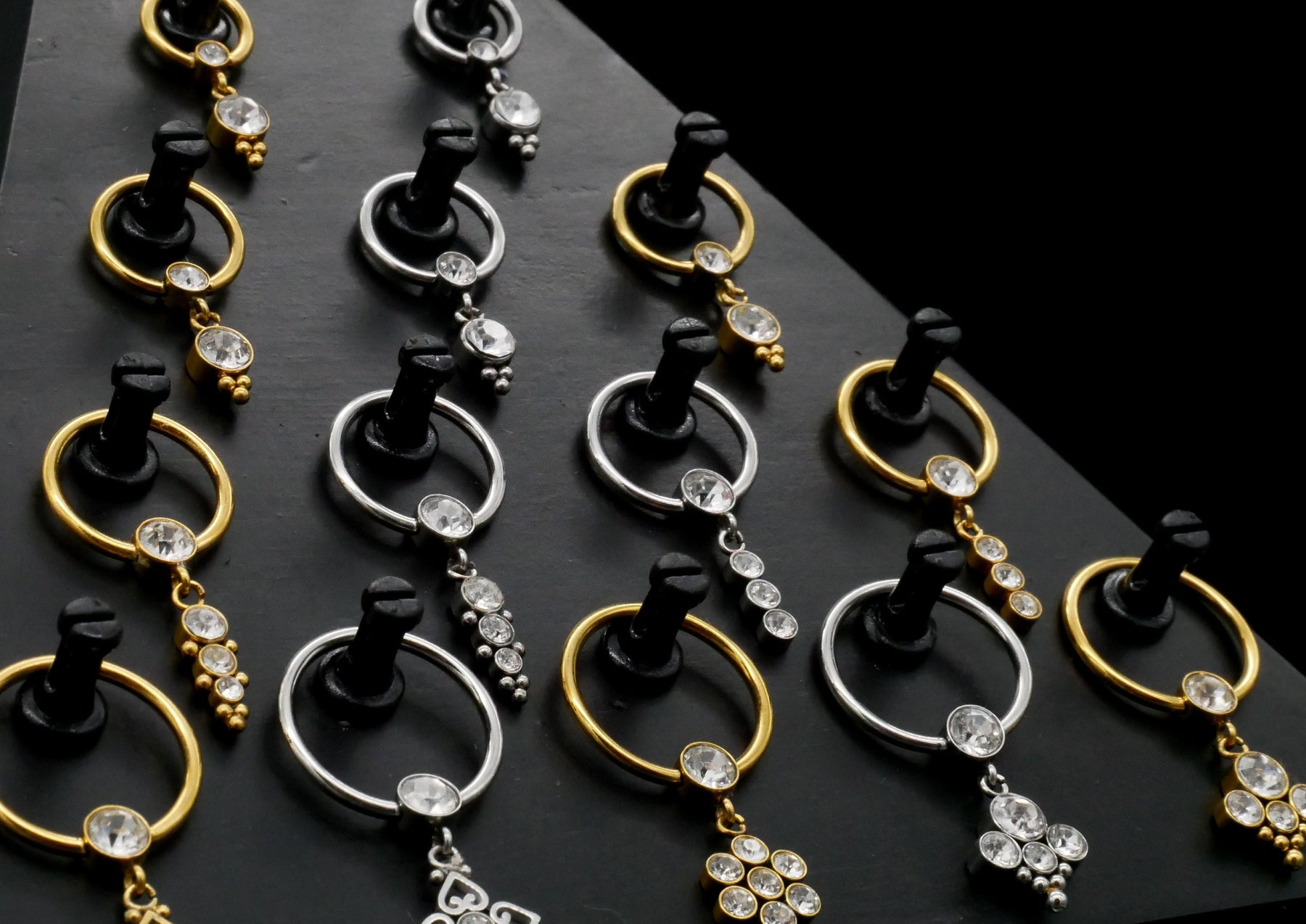 Kleine Piercings werden in schlichten, schwarzen Plastik- oder Papiertütchen geliefert, während mittelgroßer und großer Schmuck in edlen, schwarzen Faltschachteln verpackt wird.