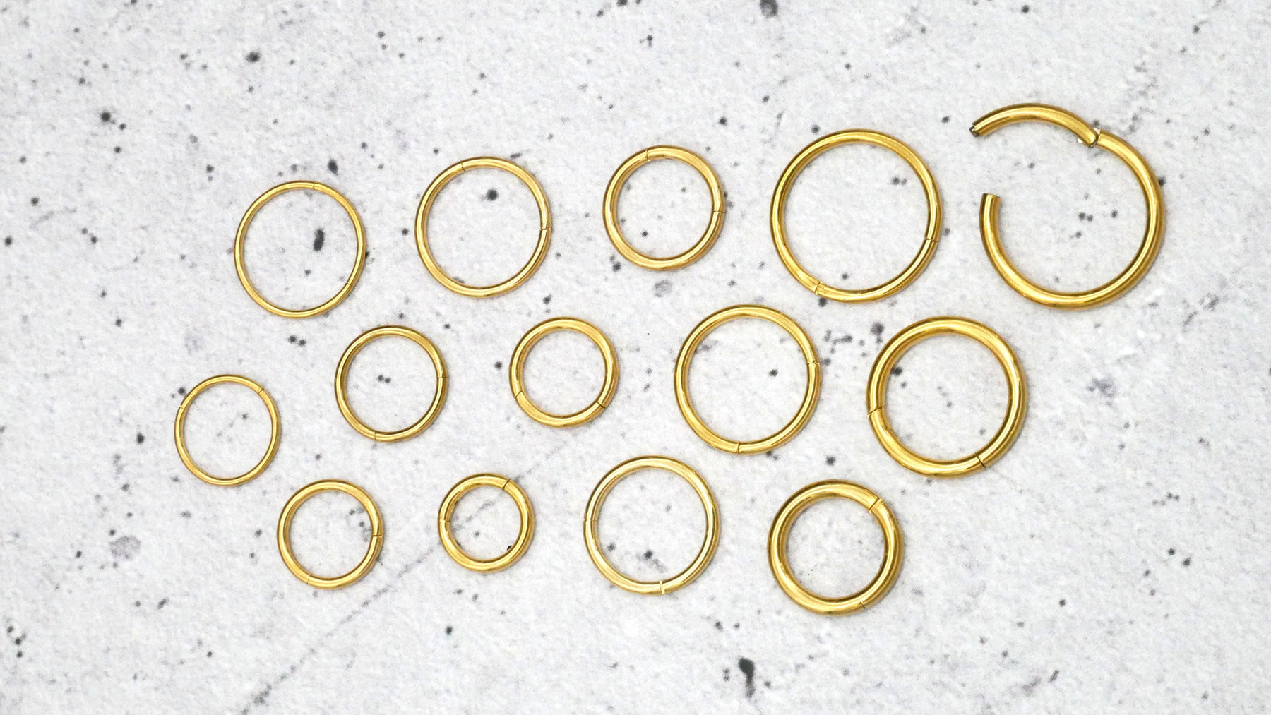 Damit du die perfekte Passform für dein Piercing Ring findest, haben wir für dich eine übersichtliche Größentabelle erstellt. Hier siehst du auf einen Blick die gängigen Maße für Stärke (Gauge), Innendurchmesser und Größen in Millimetern sowie Inches.