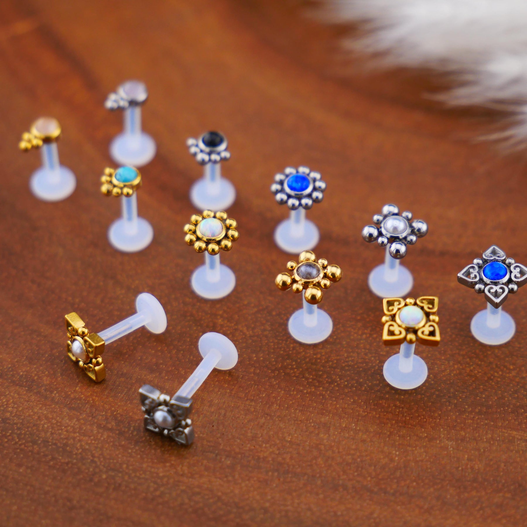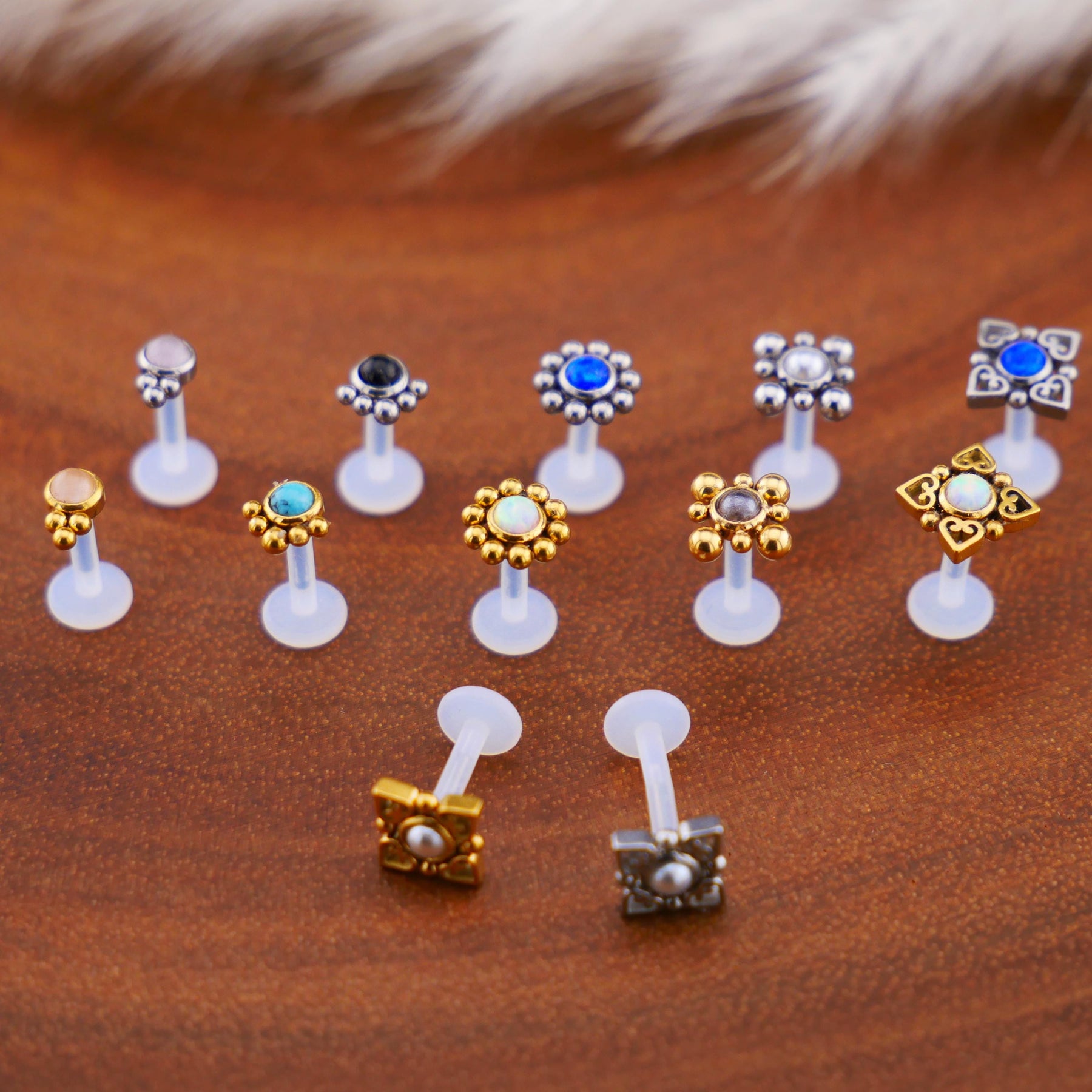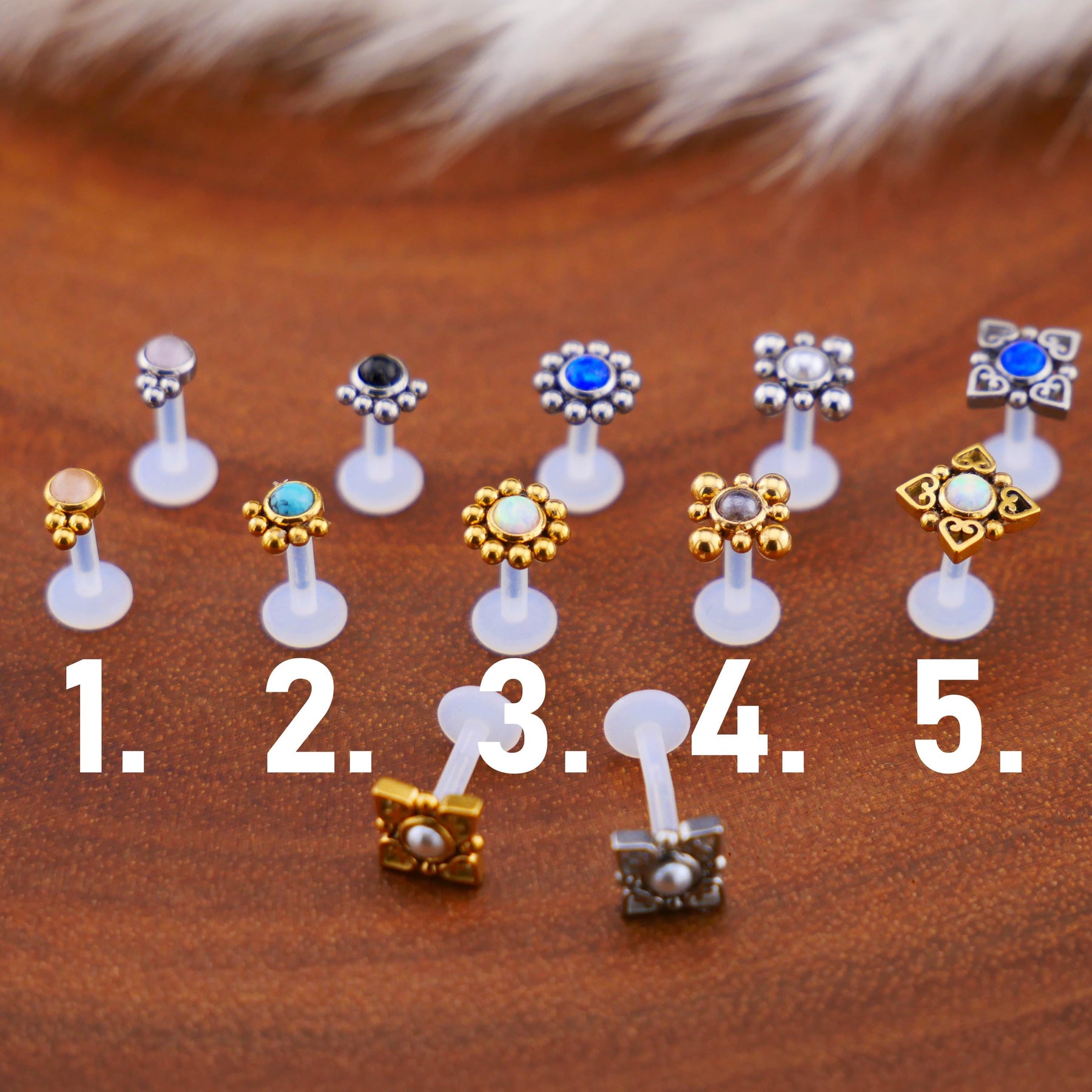Dieses vielseitige Labret kombiniert einen flexiblen Bioflex-Stab mit einem edlen Chirurgenstahl-Kopfteil, erhältlich in Gold und Silber sowie 5 verschiedenen Designs - je verziert mit einem 2mm Schmuckstein. Perfekt für Lippenpiercings, Medusa oder Tragus!