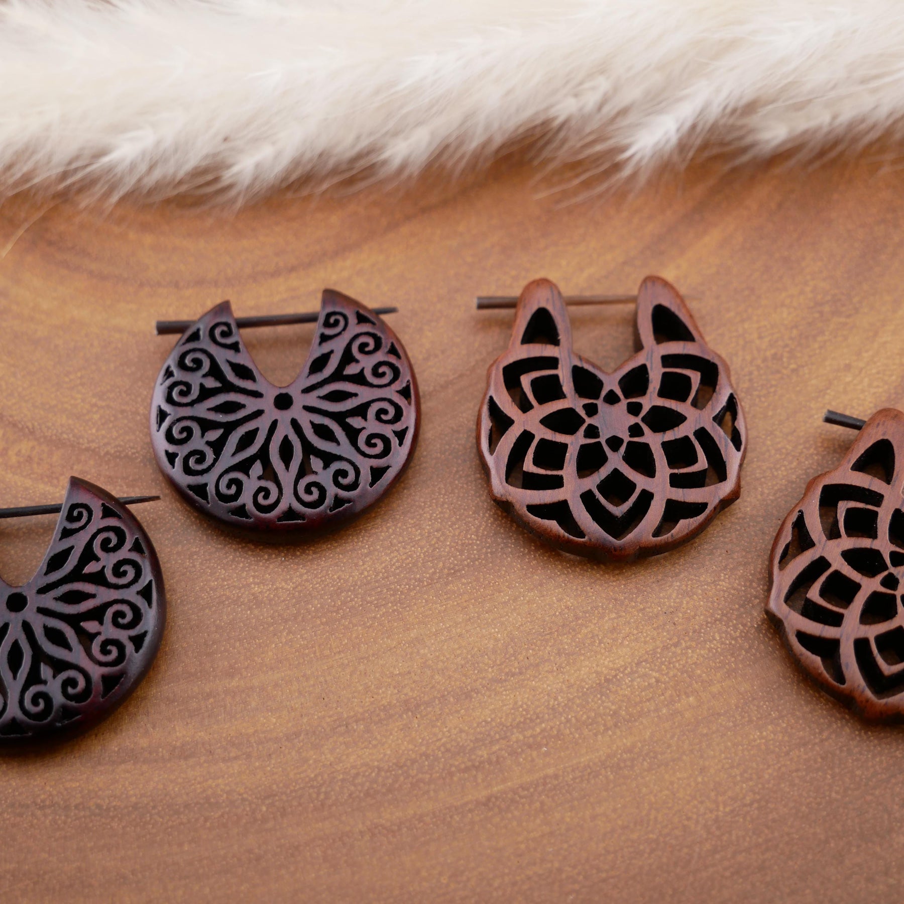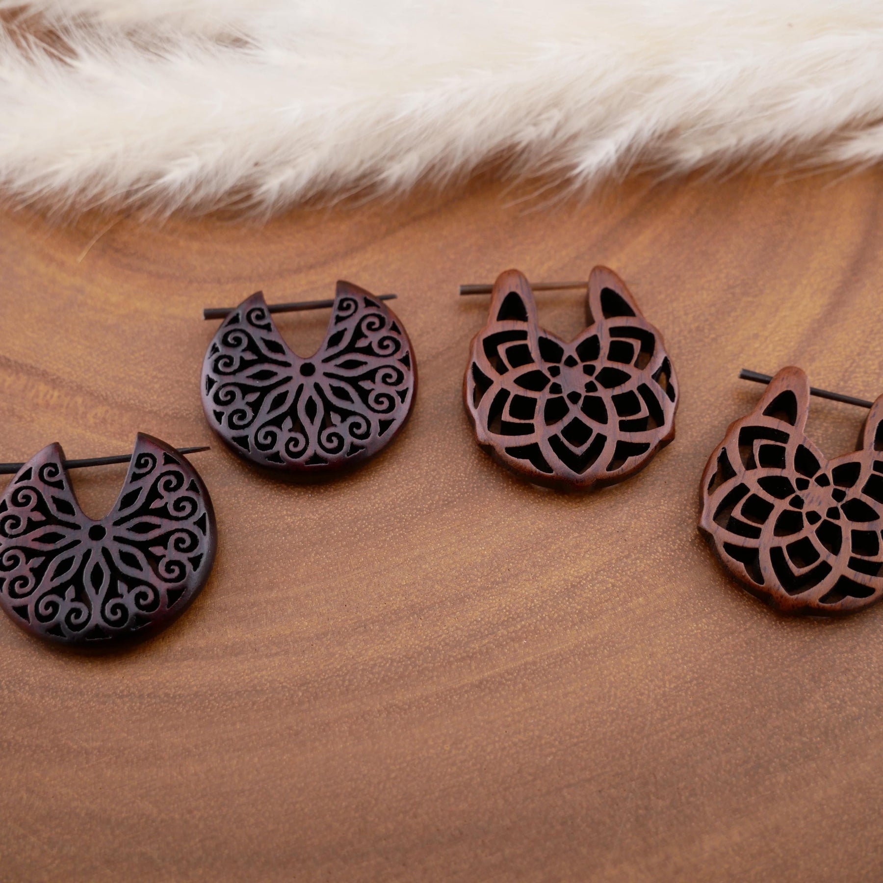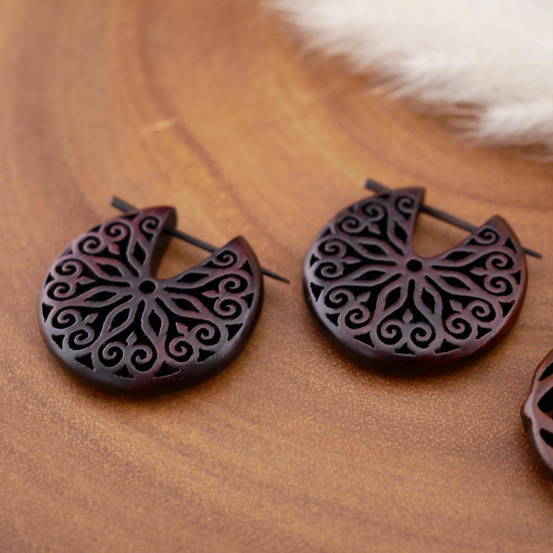 Schlichte, natürliche Ohrringe aus dunkel rotbraunem Narra-Holz - jedes Stück ein Unikat mit individueller Maserung. Das warme Holz verleiht den Ohrringen eine edle, organische Ausstrahlung.