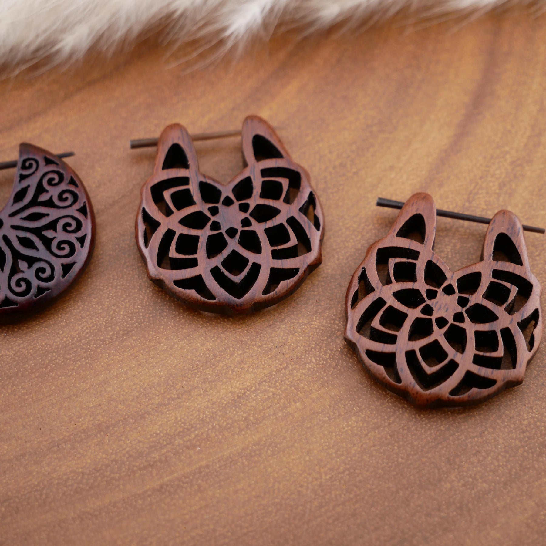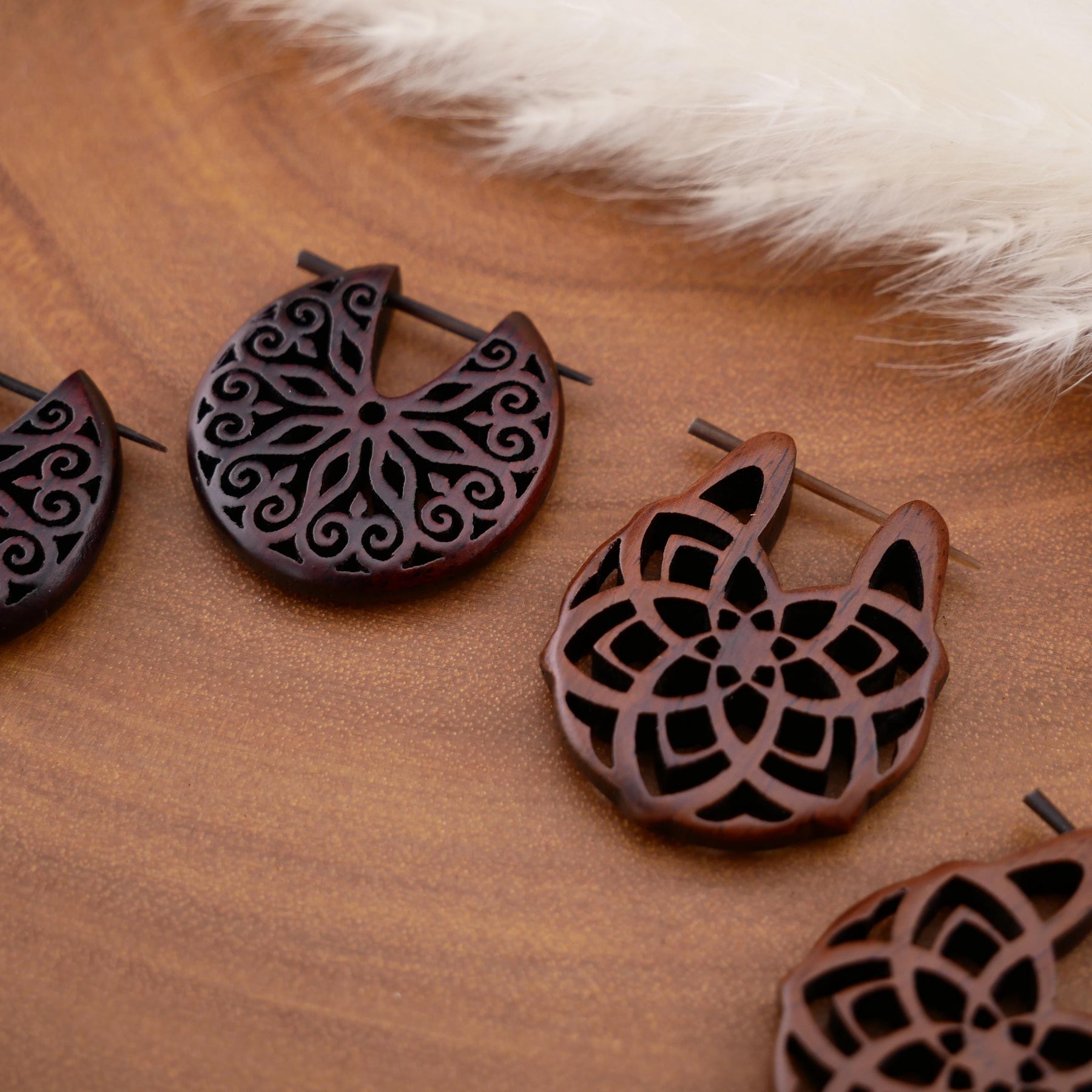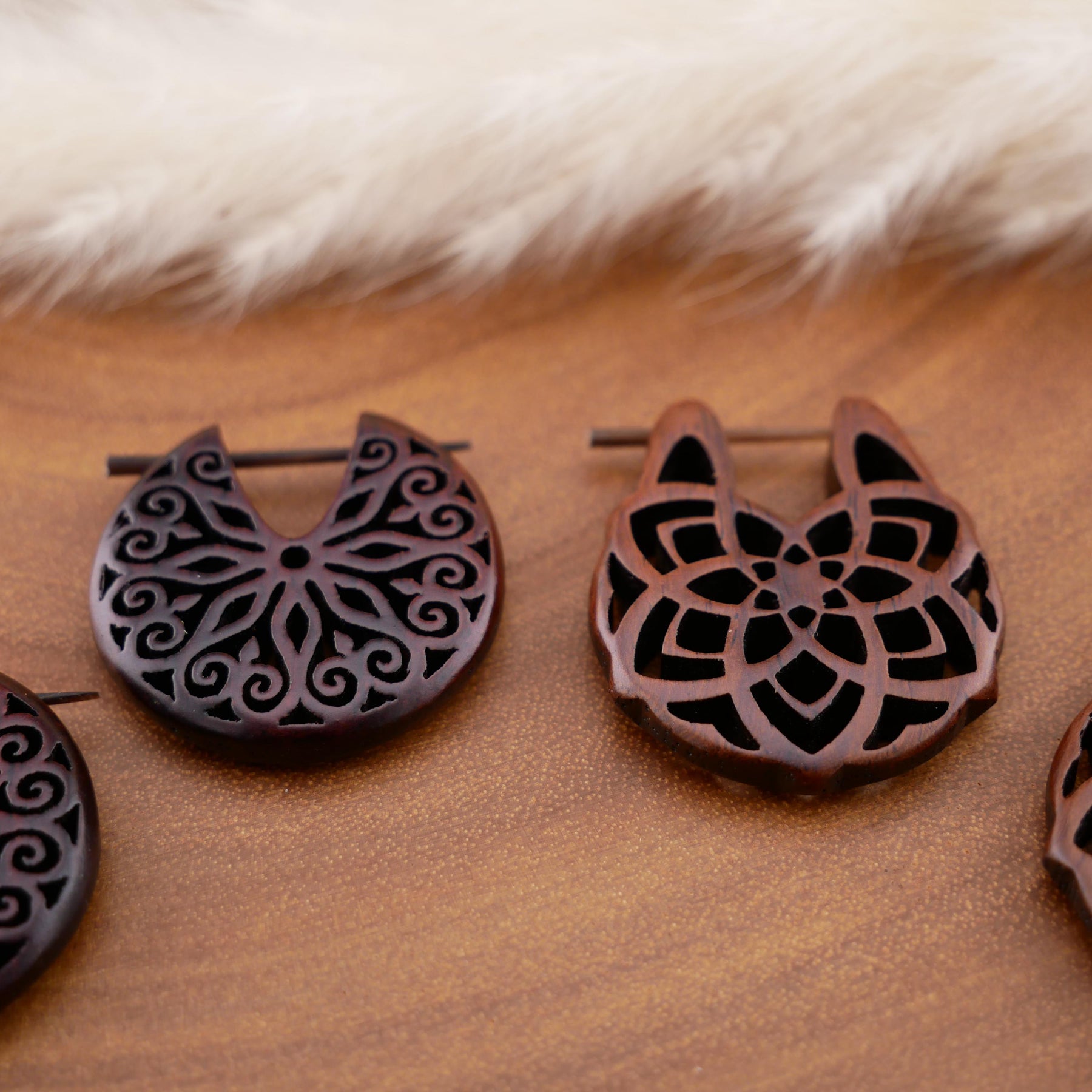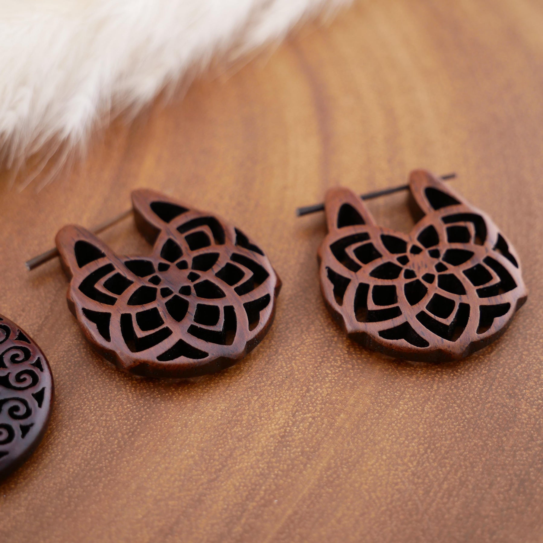 Schlichte, natürliche Ohrringe aus dunkel rotbraunem Narra-Holz - jedes Stück ein Unikat mit individueller Maserung. Das warme Holz verleiht den Ohrringen eine edle, organische Ausstrahlung.