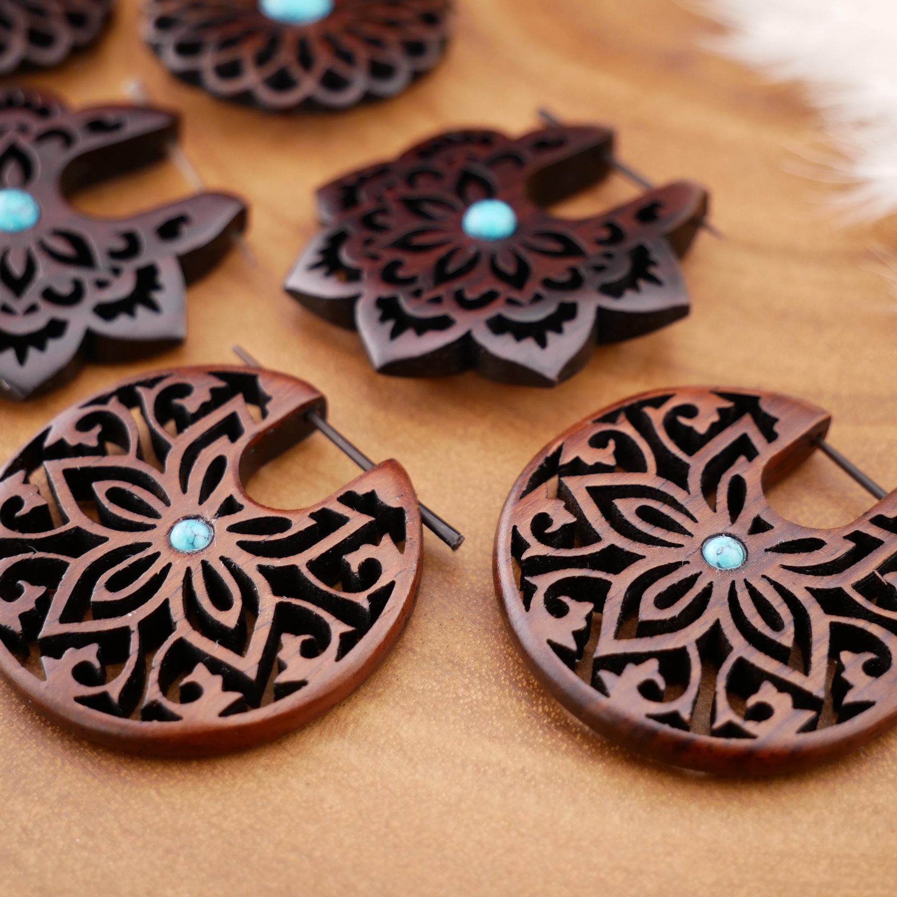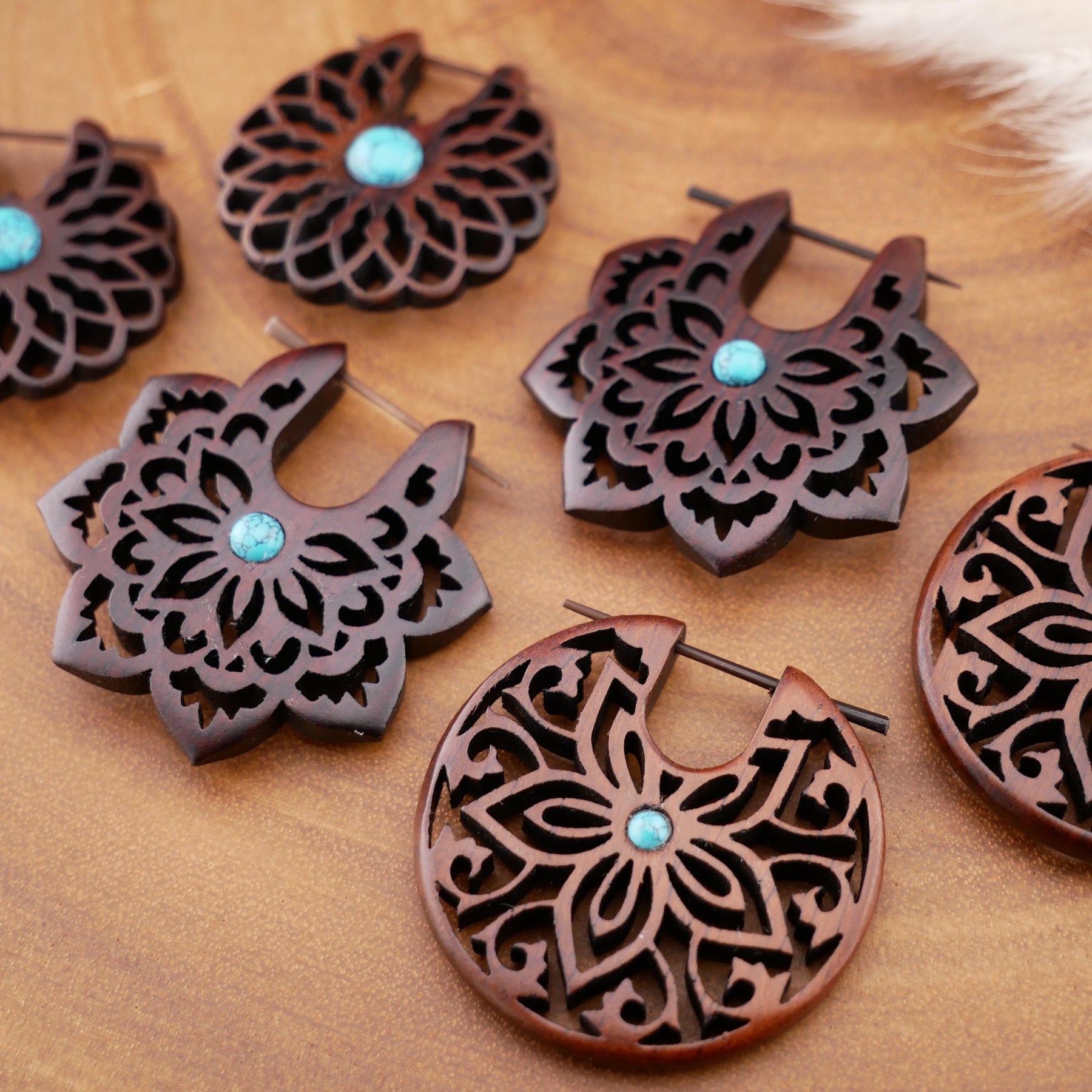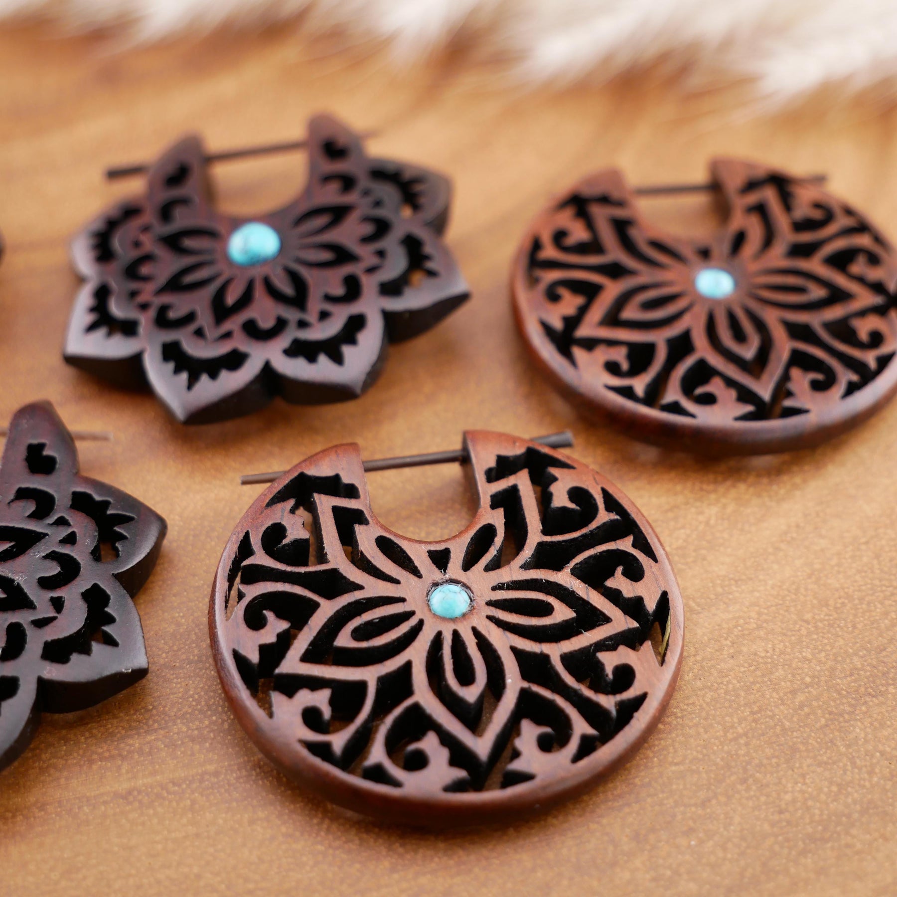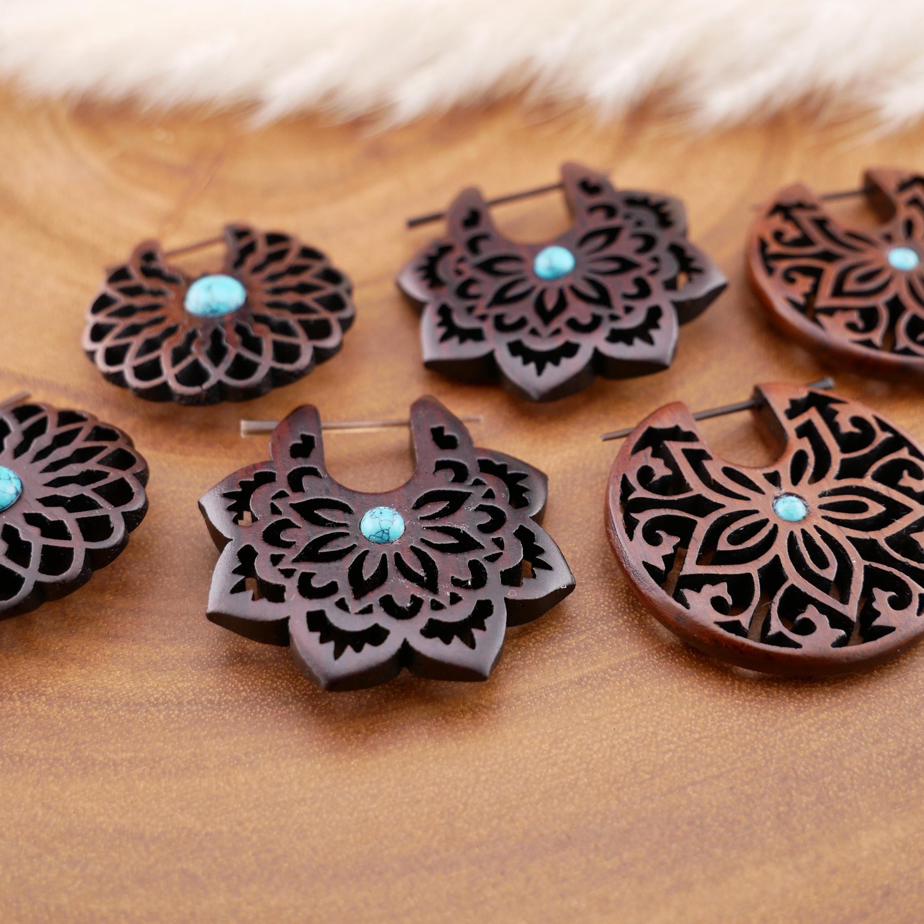 Schlichte, natürliche Ohrringe aus dunkel rotbraunem Narra-Holz - jedes Stück ein Unikat mit individueller Maserung. Das warme Holz verleiht den Ohrringen eine edle, organische Ausstrahlung.