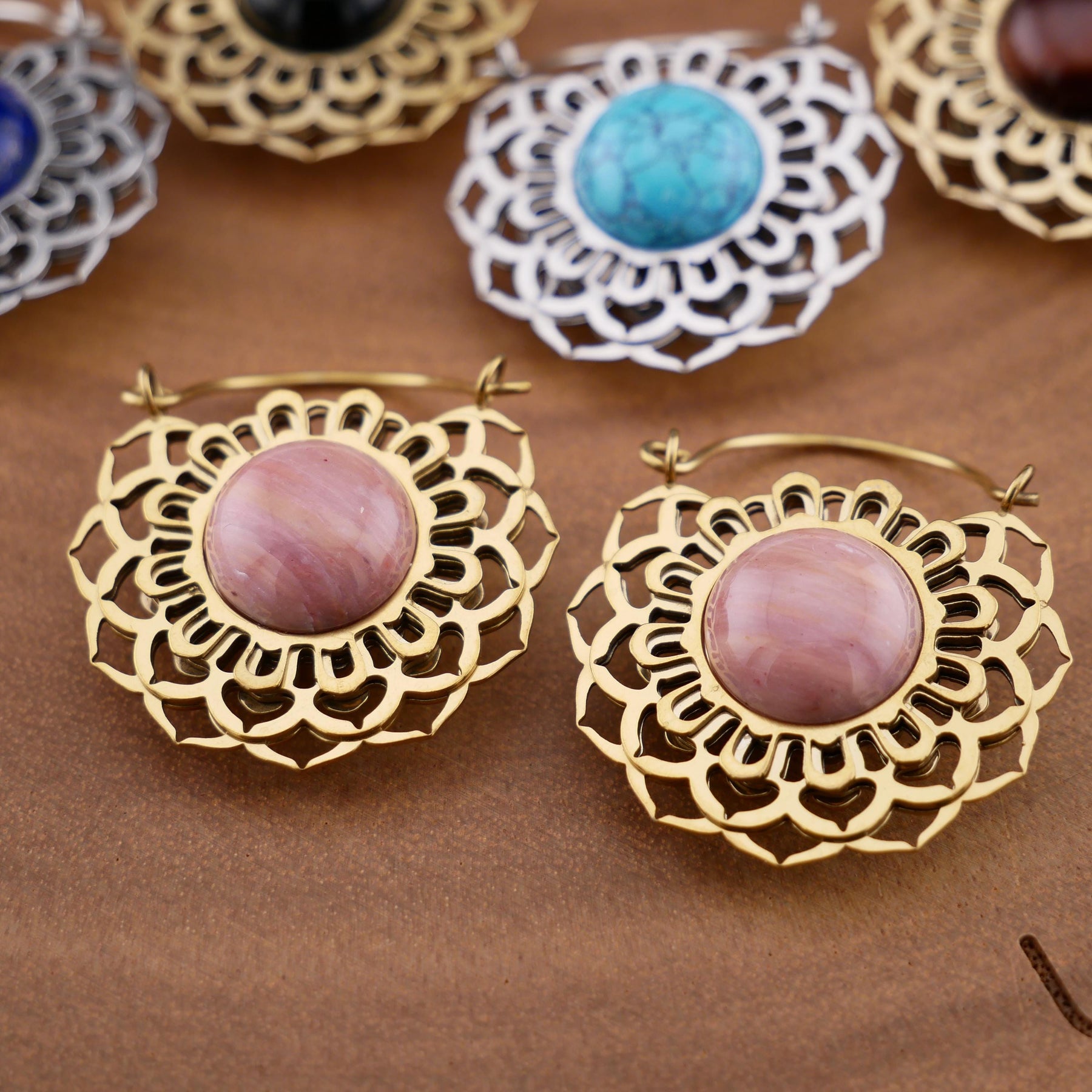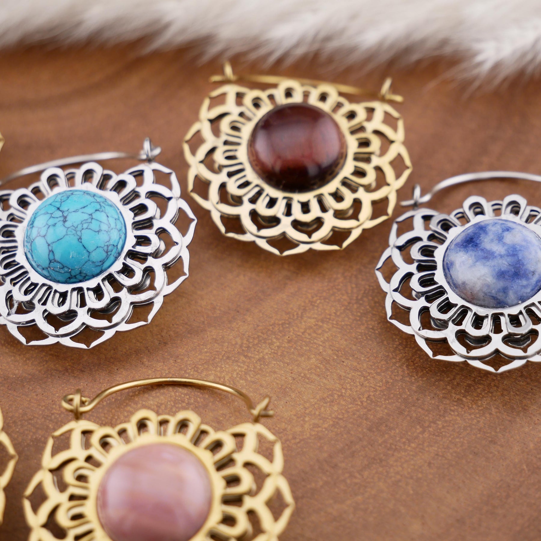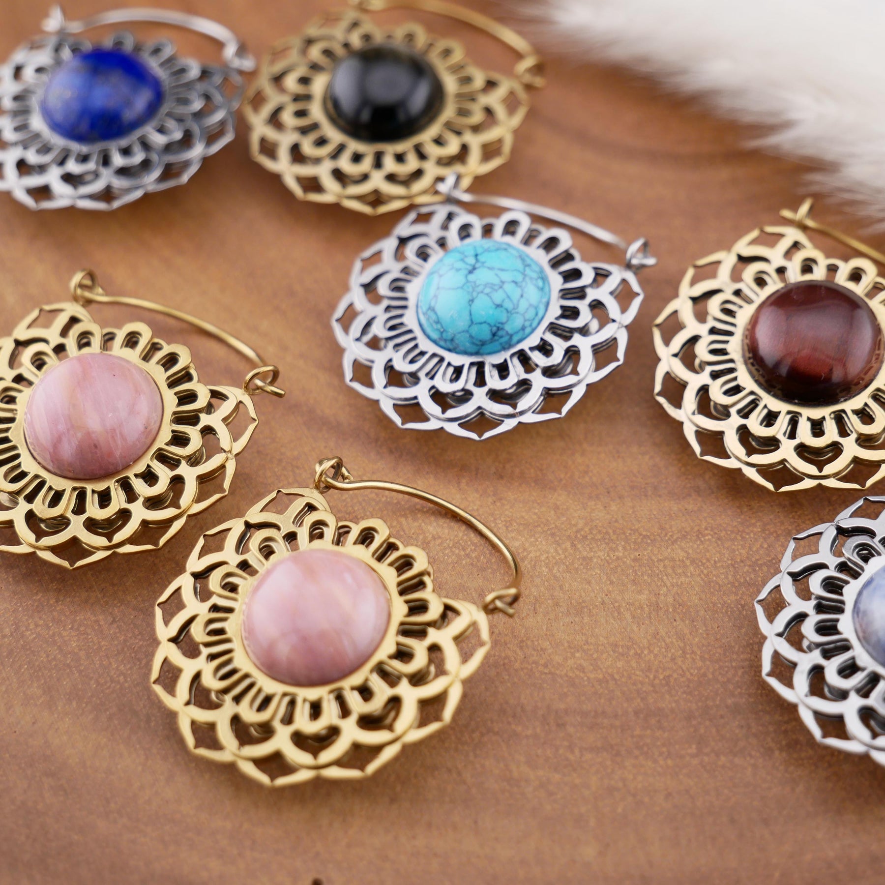 Tolle Ohrringe mit 1,0mm Bügel, 28mm Breite und 35mm Höhe. Golden Obsidian, Blue Lapis, fossilisiertes Holz, rotes Tigerauge, Türkis und schwarzer Onyx. Jeder Stein ist ein Unikat mit seiner eigenen Maserung und Farbintensität.