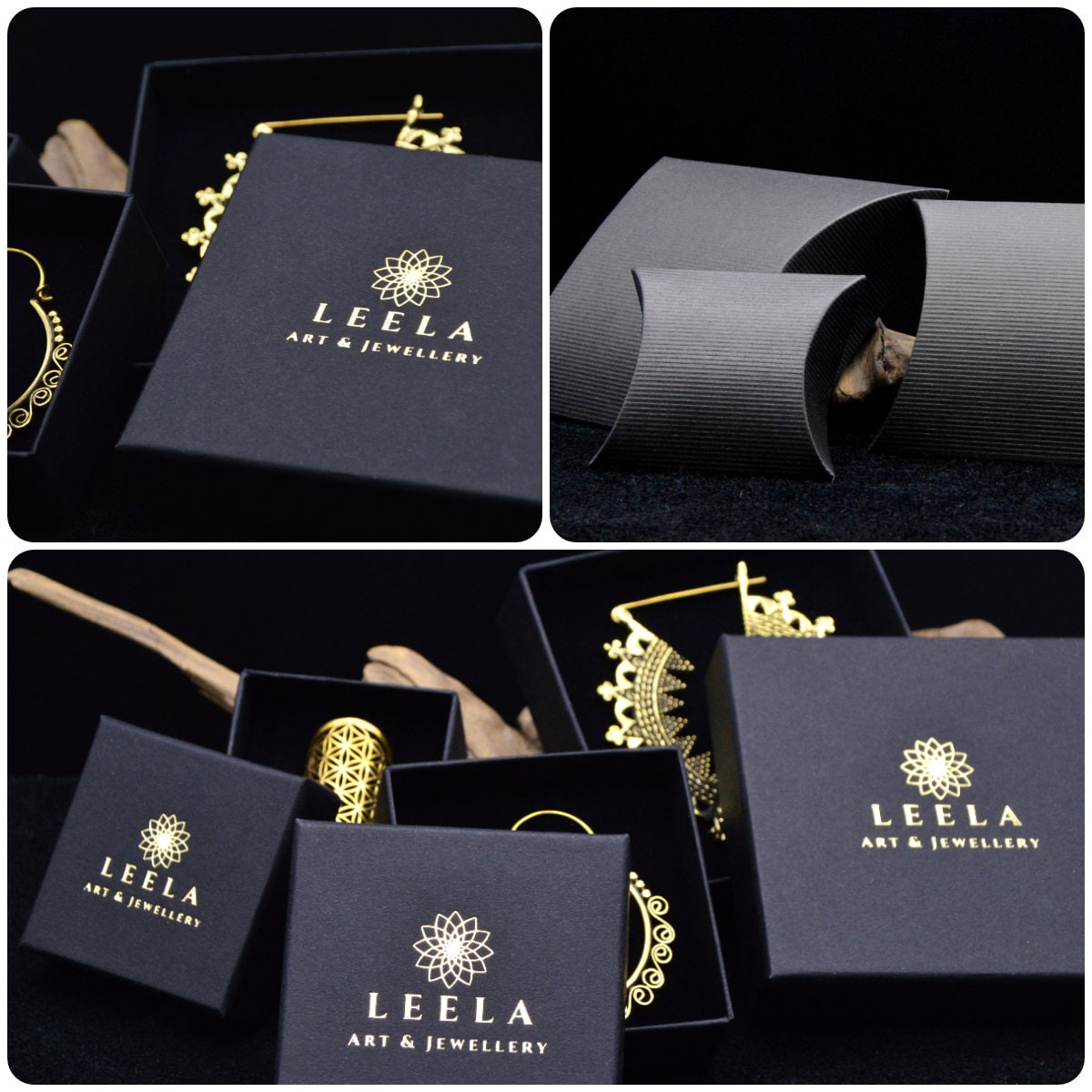 Kleine Piercings werden in schlichten, schwarzen Plastik- oder Papiertütchen geliefert, während mittelgroßer und großer Schmuck in edlen, schwarzen Faltschachteln verpackt wird.
