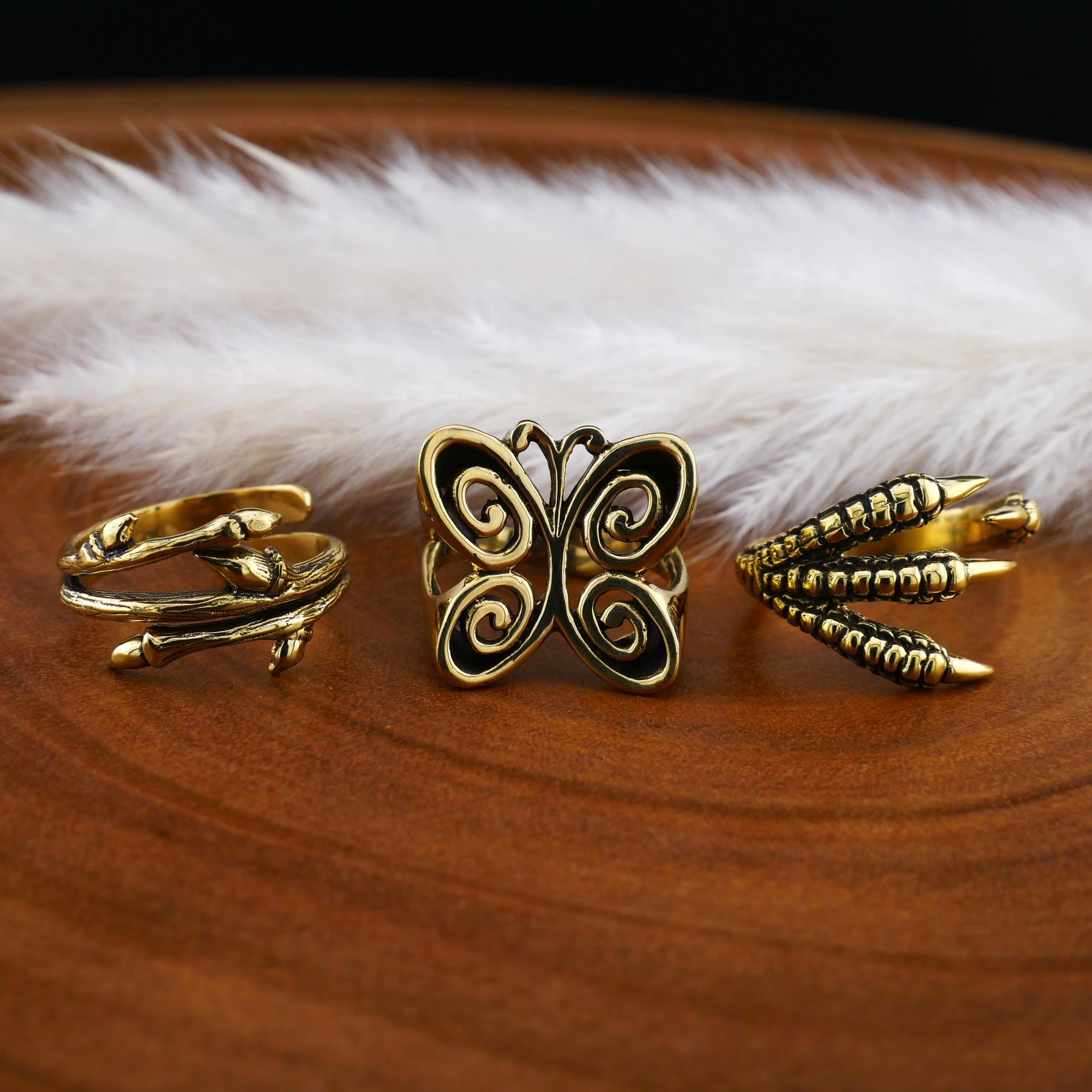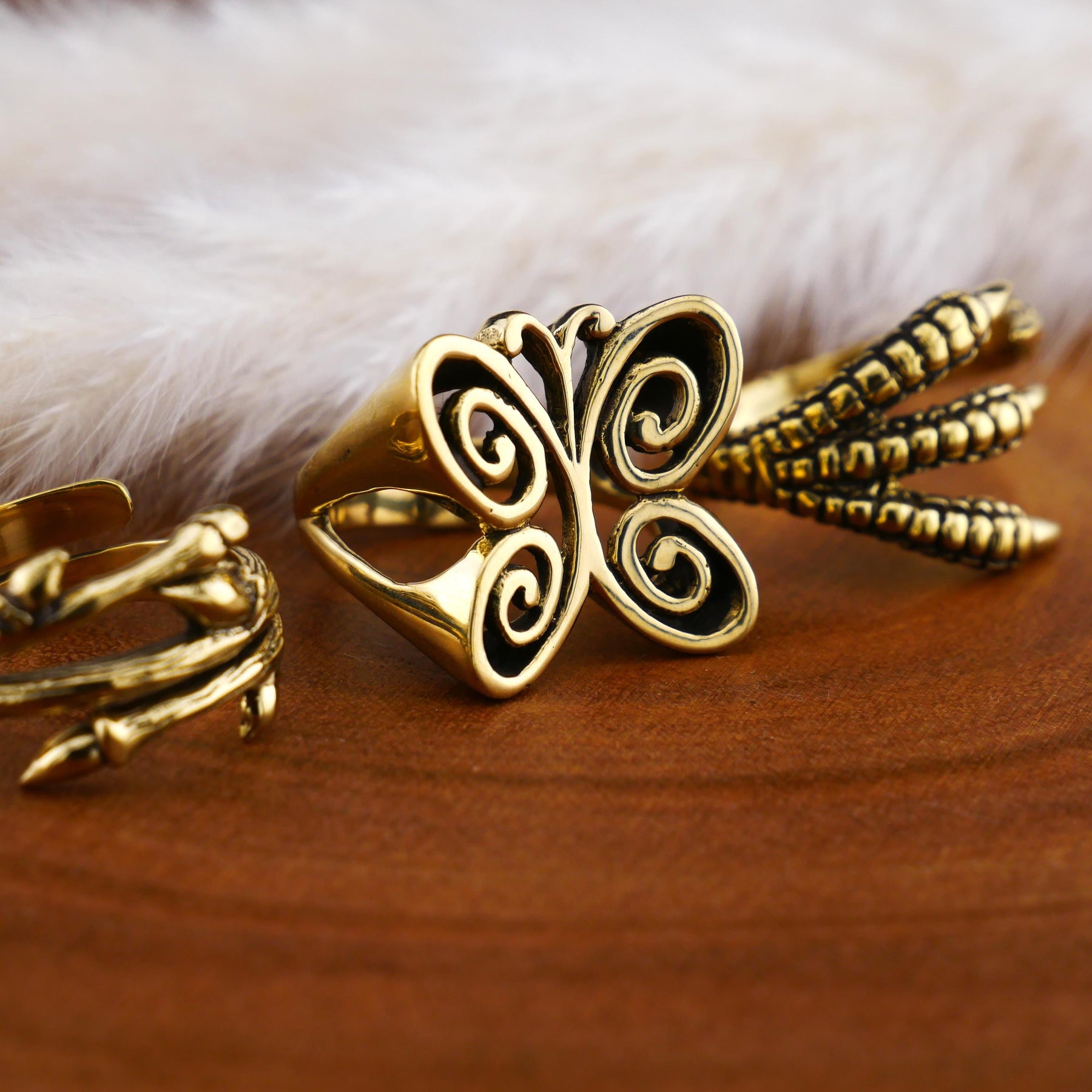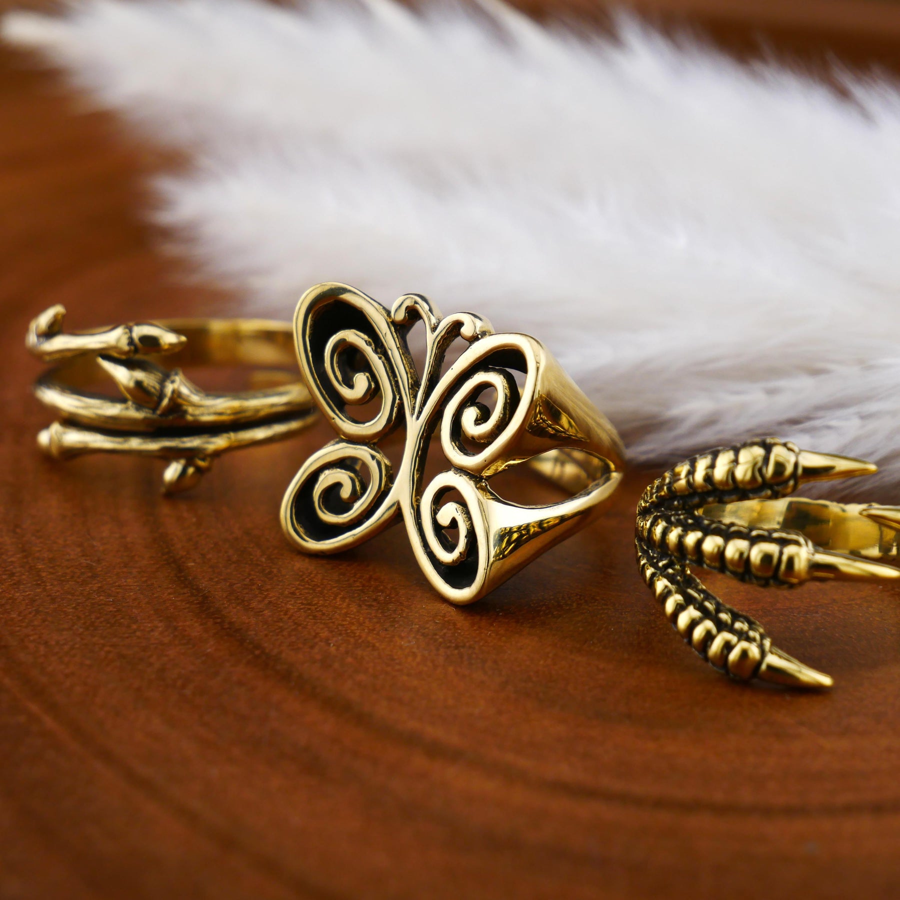 Dieser besondere Ring aus Messing verleiht deinem Look einen einzigartigen Touch. Du kannst zwischen drei faszinierenden Motiven wählen. Der Ring ist im Unisize erhältlich und passt sich perfekt an. Ein stilvoller Hingucker für jeden Anlass!